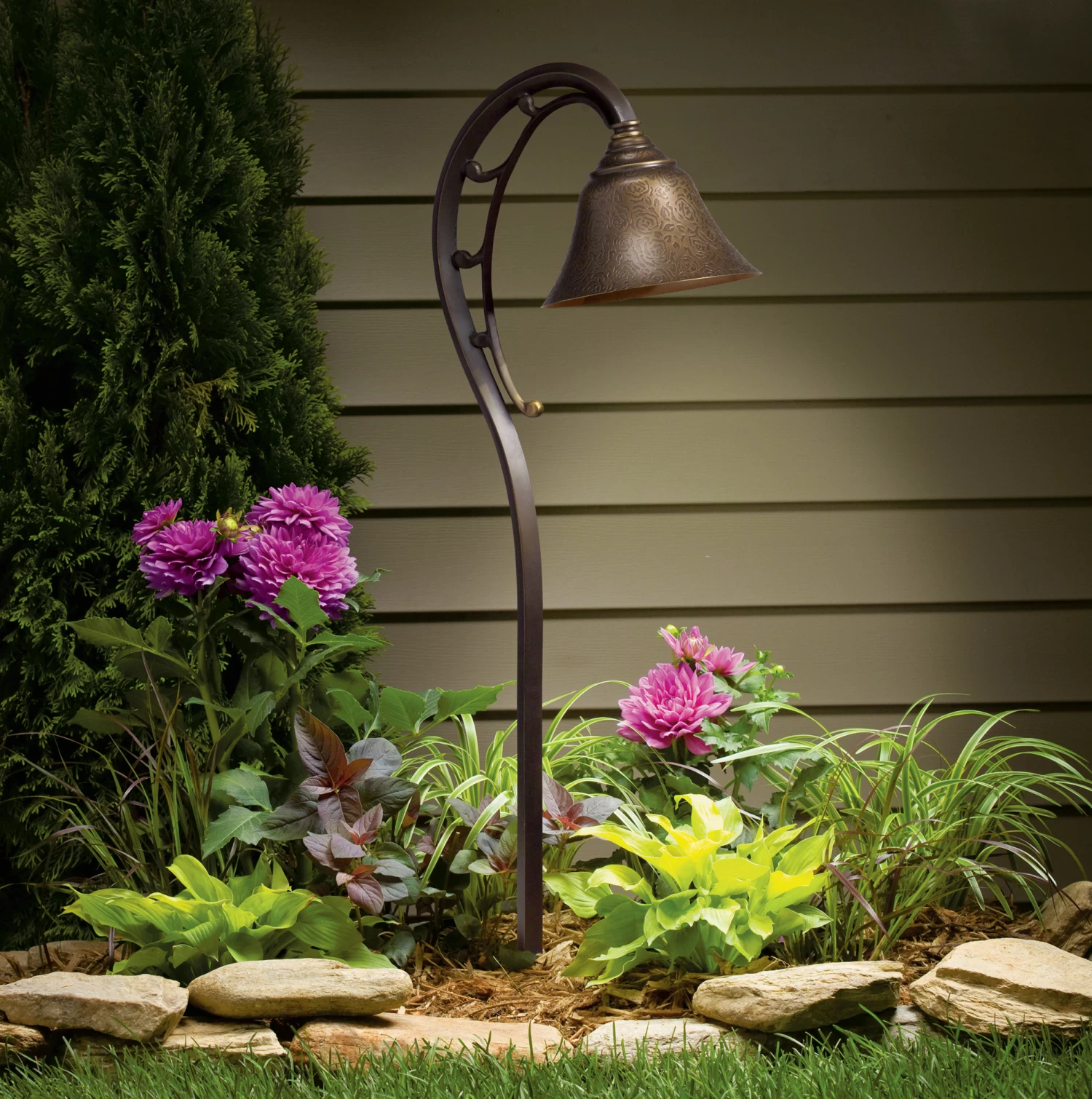 The 12 Volt Intaglio Crook Neck Path Light features a richly detailed solid and heavy crook neck with a brass shade engraved and etched with an organic pattern. Finish in Olde Bronze. One 12 volt, T5 wedge base LED up to 2 watts is required, but not included. Includes 8 inch in-ground stake, 24 inch leads, and cable connector. ETL listed. Suitable for wet locations. Required transformer and optional accessories sold separately.