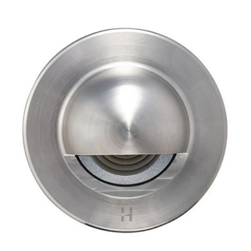 The Step Lite Solid Eyelid Outdoor Light is designed with a 3.5 inch flange and recessed body for flush mounting into canister for concrete masonry, stone or wood, providing illumination of steps and low level features such as exterior paved areas. When used with Hunza mounting canister there are no mounting holes in the flange. The eyelid feature eliminates all upward light, providing an excellent glare-free illuminating effect. Machined from thick aluminum in powder coat finish Bronze or Black, solid Copper, or 316 Stainless Steel with a clear tempered stepped glass lens. UL listed. IP67 rated for wet locations.