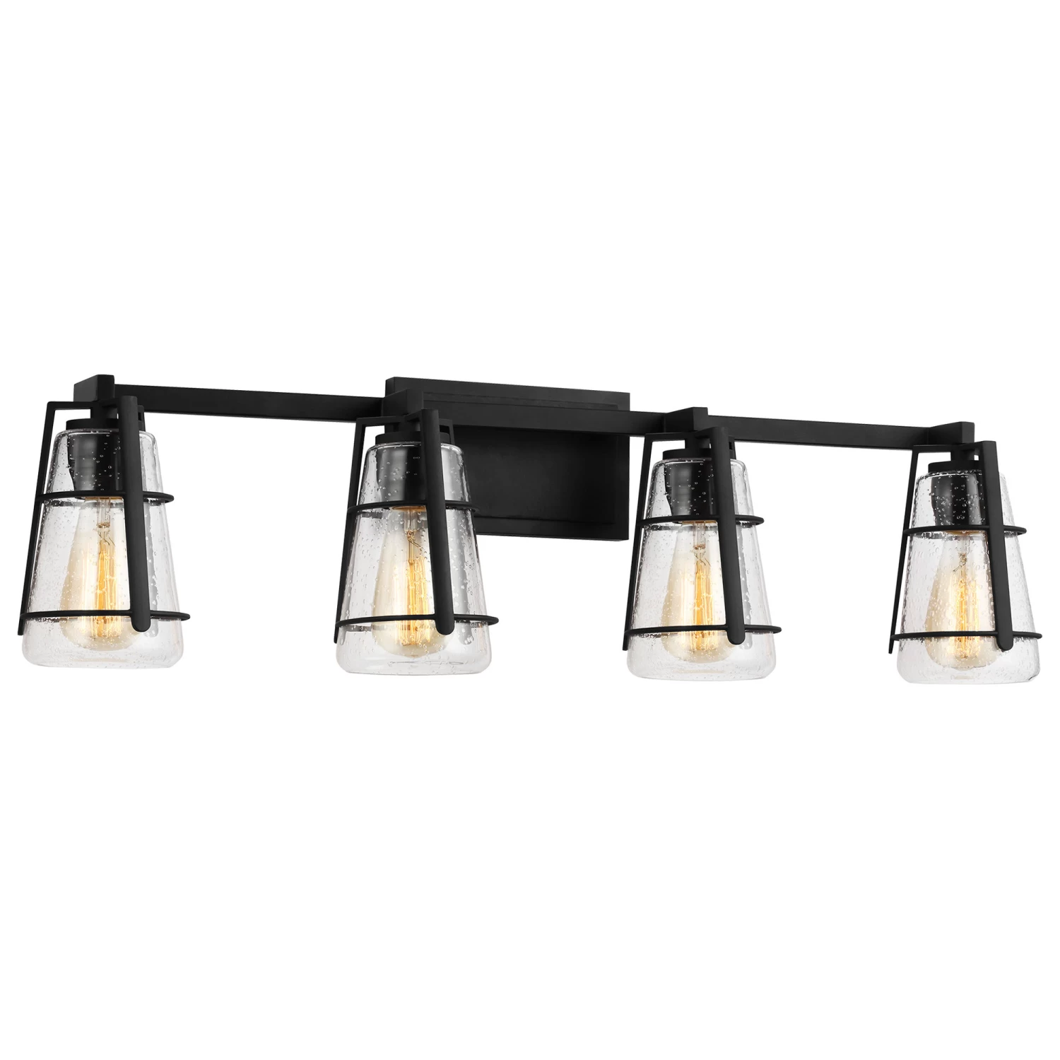 The Adelaide Bathroom Vanity Light features a Clear Seeded glass shade that subtly diffuses the lamping while allowing the exposed bulb to be a central design element of the fixture with a Midnight Black finish. Available with two, three or four lights. Fixture may be mounted in the up or down position. ETL listed. Suitable for damp locations.