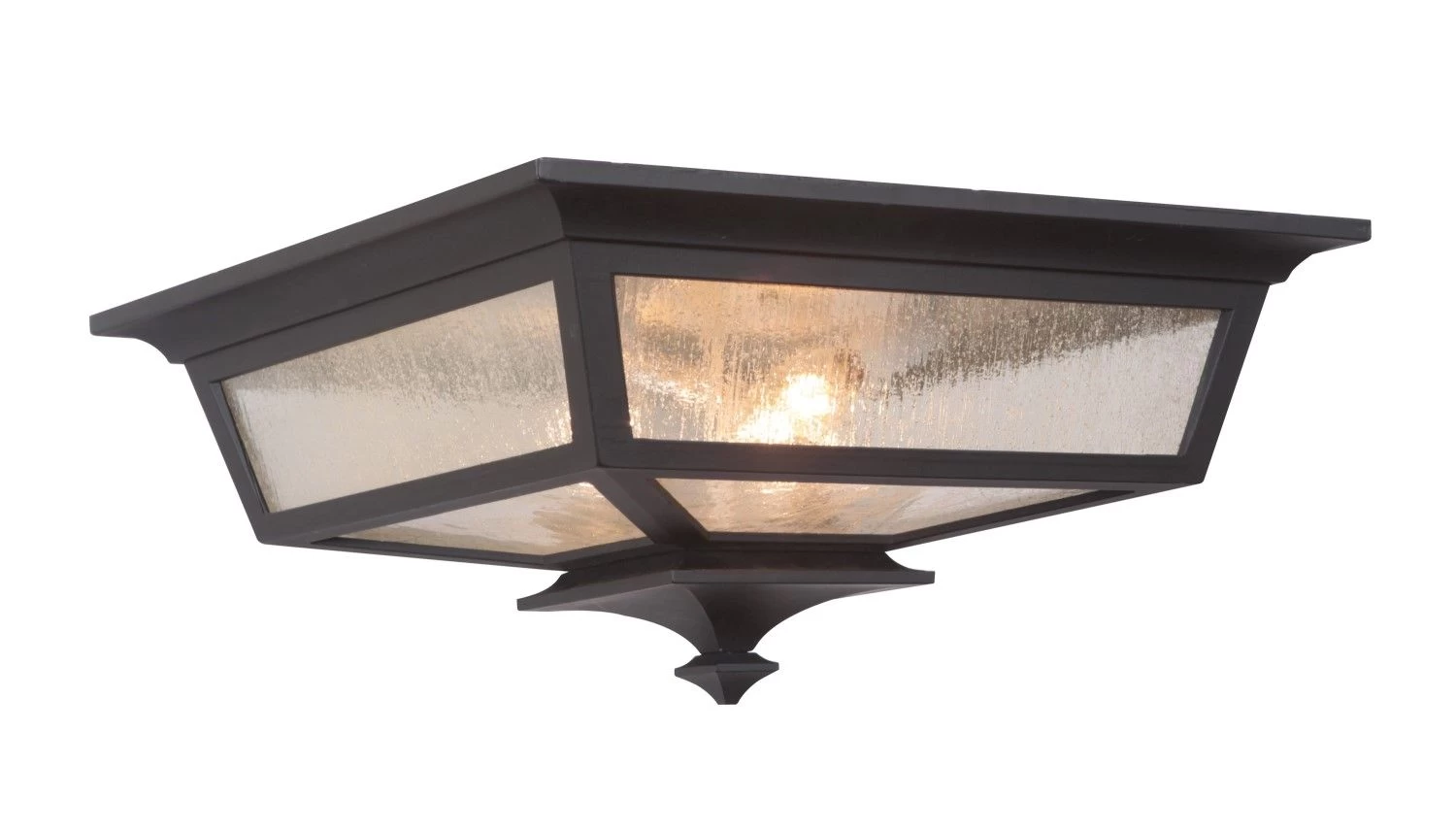 Argent Outdoor Ceiling Light Fixture adds an appealing rustic style designed to withstand the outdoor elements. Available with Clear Seeded glass with a Midnight finish, Clear Seeded glass with an Aged Bronze Textured finish, or Champagne glass with an Aged Bronze Textured, treated with UV guard. Damp location rated.