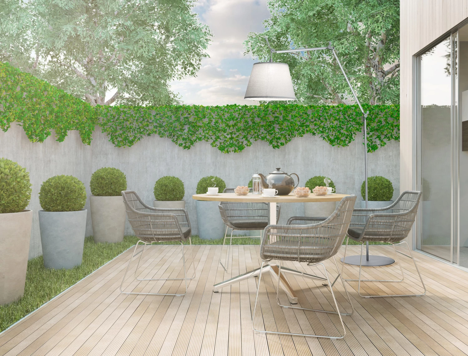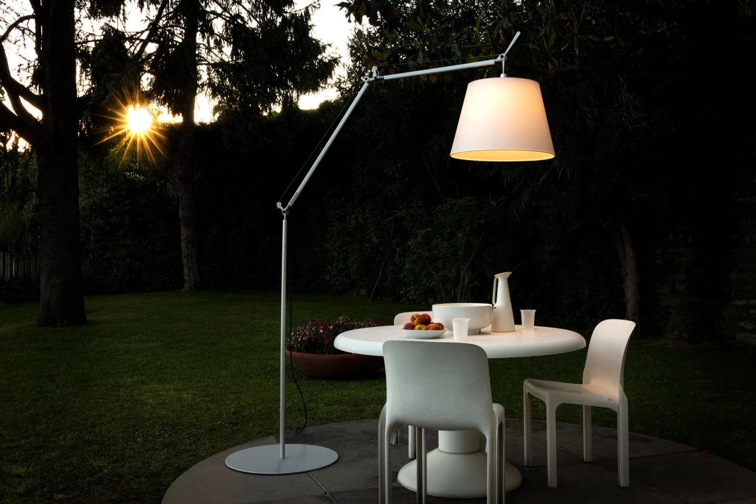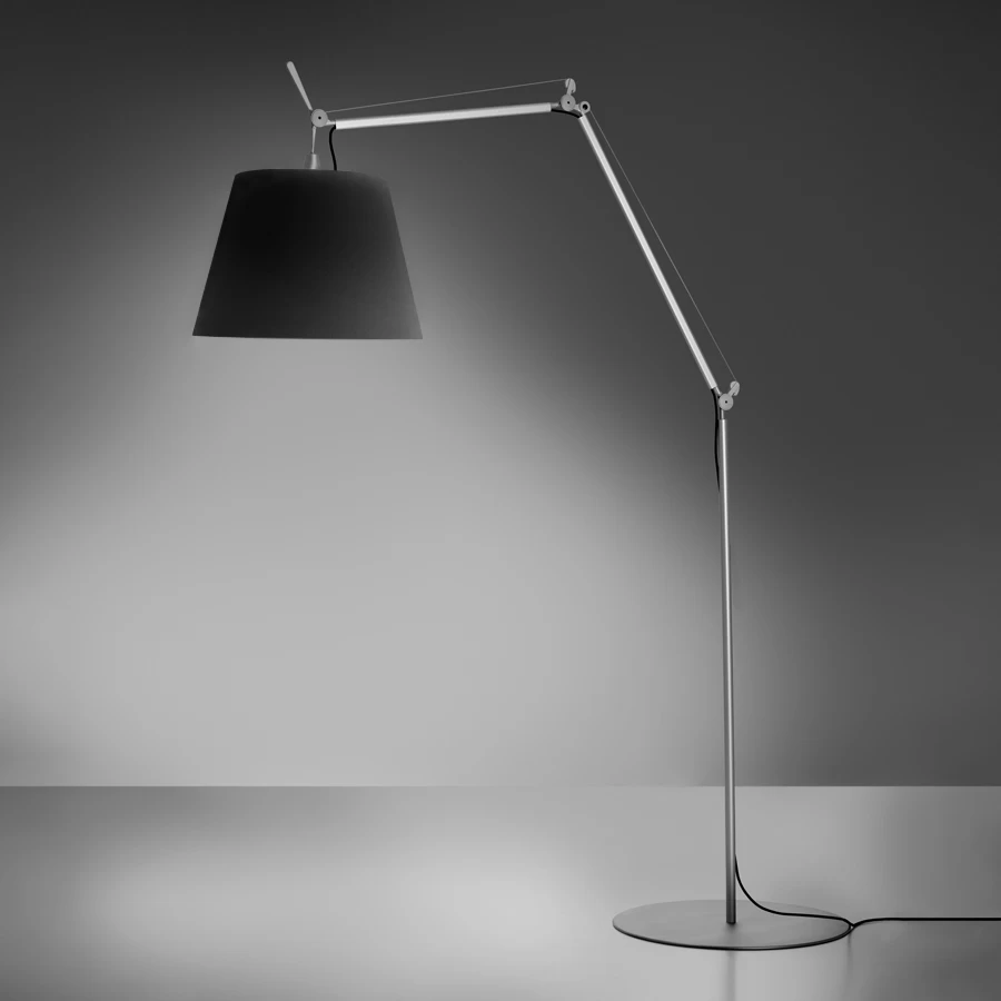 The Tolomeo Mega Outdoor Floor Lamp features an aluminum base and body with a Paola Lenti Thuia fabric shade in spun White, woven Dove, or woven Black. Dimmable via 2-wire dimming. UL listed for wet locations. IP65 rated.