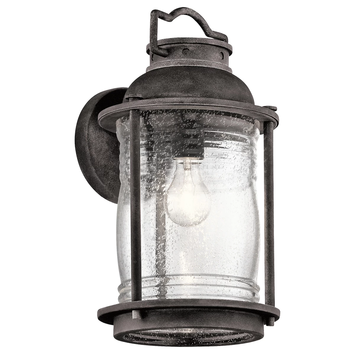 The Ashland Bay 1 Light Outdoor Wall Light features a traditional design enhanced by a Weathered Zinc finish and Clear glass. Three sizes available. One 75/100/150 watt max 120 volt medium base bulb is required, but not included. Ideal with vintage-style filament bulbs. Small: 6 inch width x 11 inch height x 6.75 inch depth. Medium: 7.5 inch width x 13.5 inch height x 8.25 inch depth. Large: 8.75 inch width x 16 inch height x 9.5 inch depth. UL listed for wet locations.
