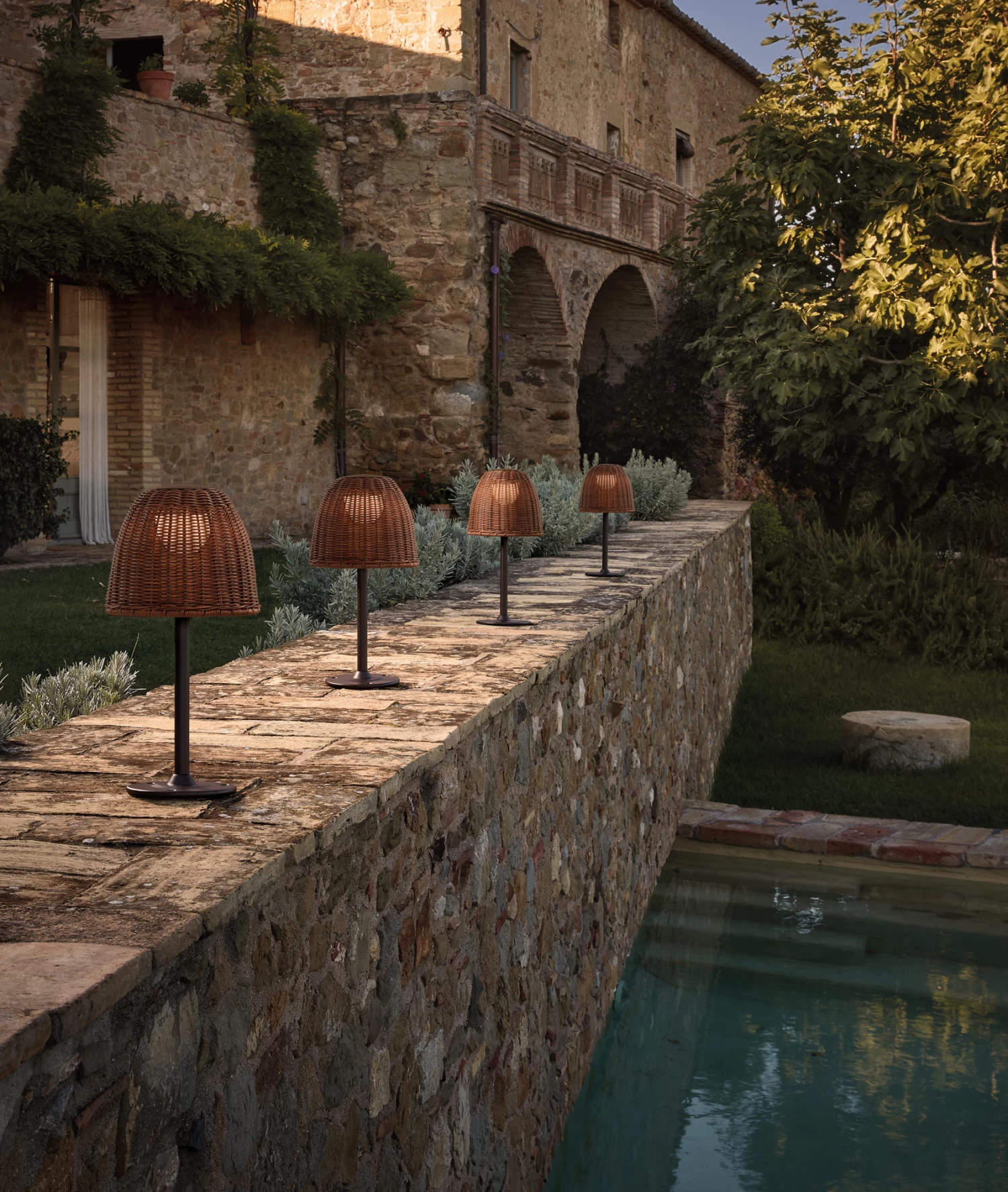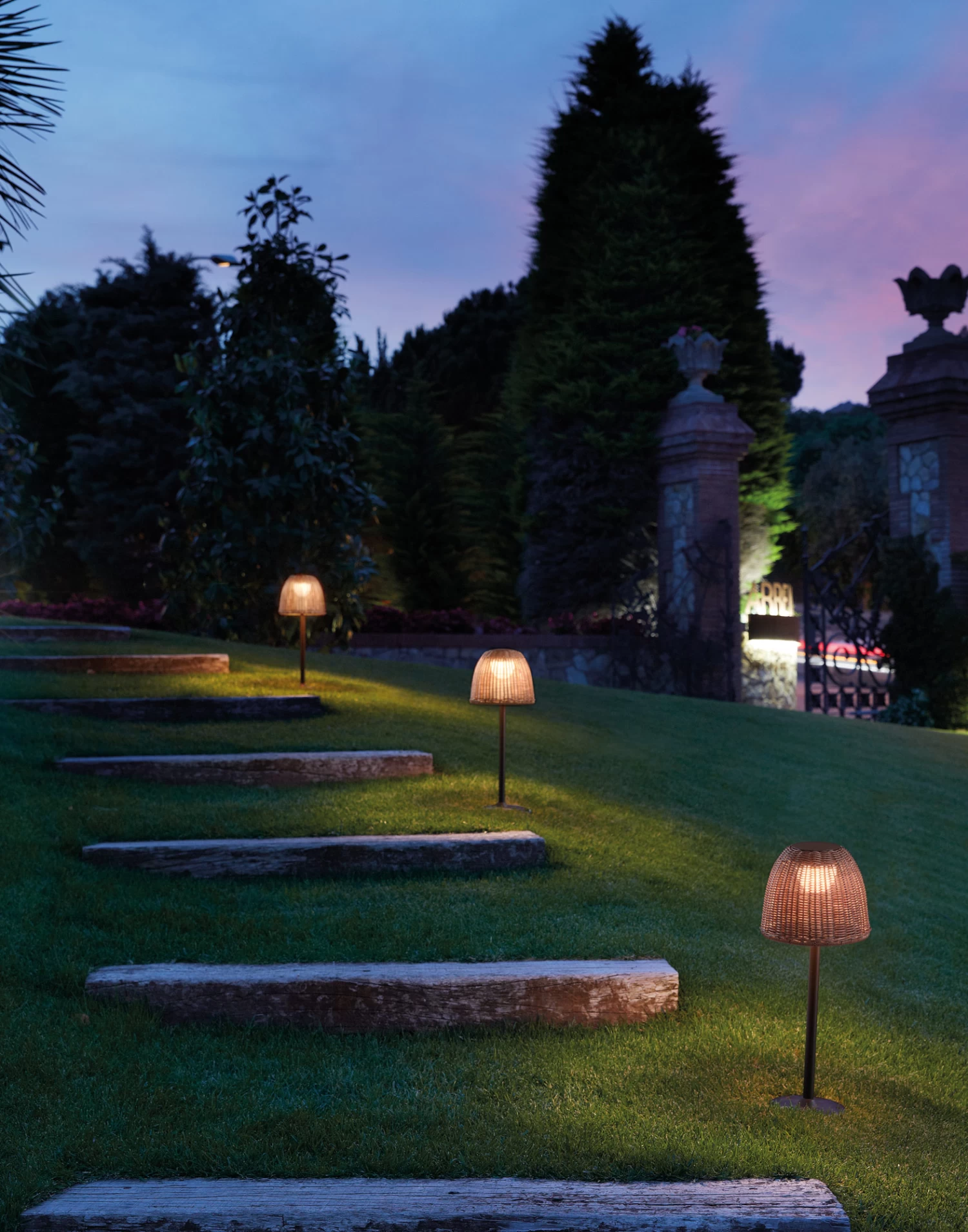 The Atticus Outdoor Path Light is light and simple in design yet offers a range of possibilities through its sophisticated, understated charm. The shade is hand-woven out of recyclable, non-toxic synthetic polyethylene fiber, and inside is a UV-resistant polyethylene globe diffuser. Designed as decorative garden lighting, the Atticus illuminates trees and plants while lending a warm feel to the space. TRIAC dimmable.