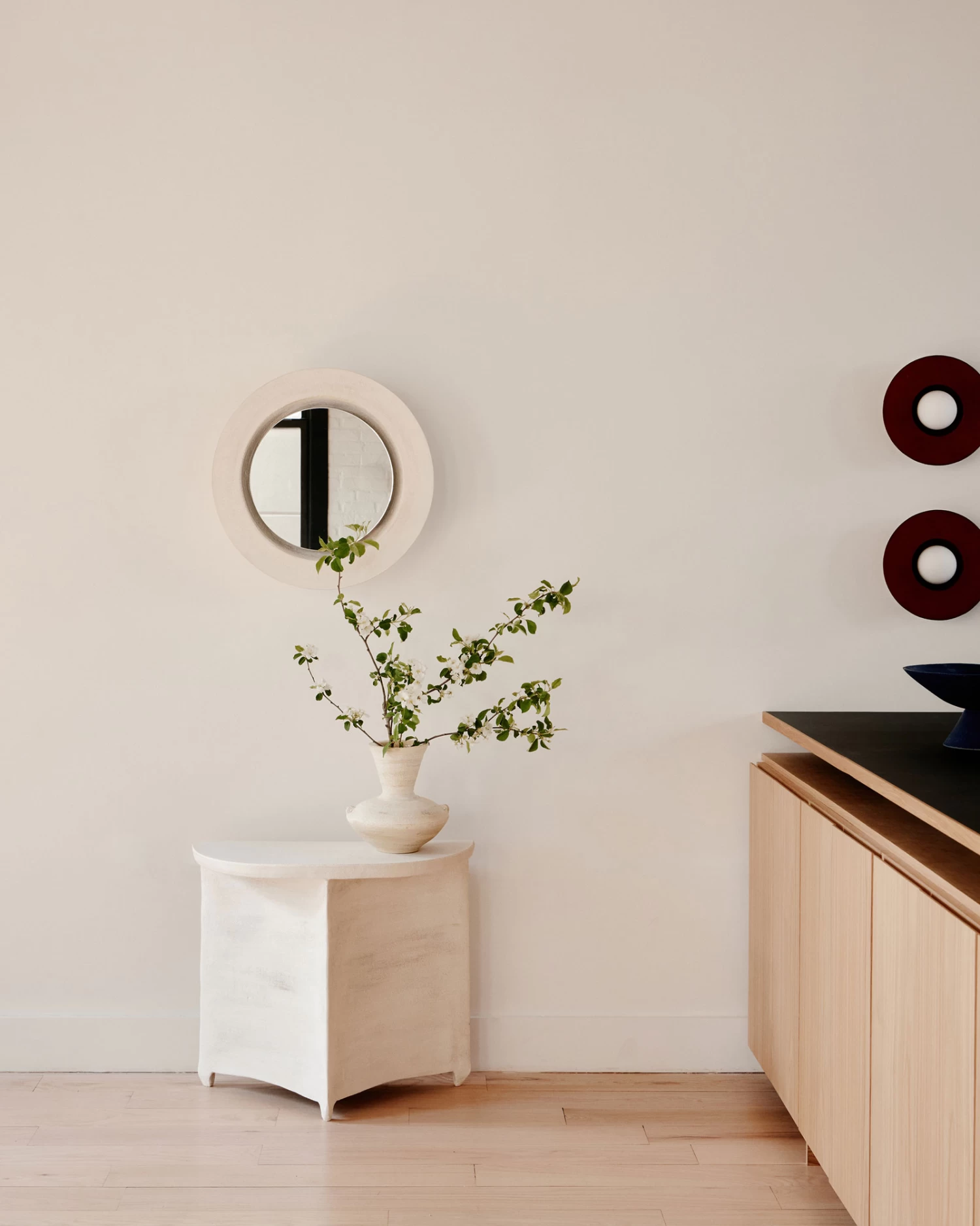 The Augustus Wall Mirror is part of the Terra series and was made in collaboration with ceramicist Danny Kaplan. It features a rounded Clay body supporting a Mirrored Glass surface and integrated backlight. Due to the handmade nature of this item, no two are identical. Warm on dim: 1800K-3000K