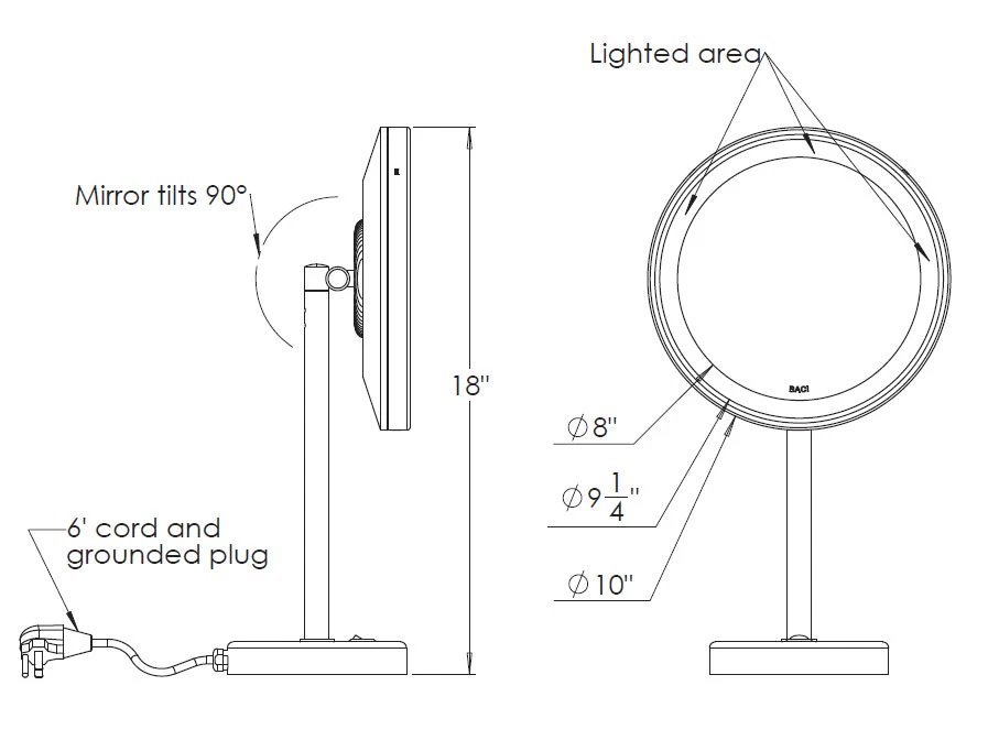 Baci Senior Fixed Height Vanity Mirror has a solid brass construction and optical quality 5x magnification glass mirror with high power natural white LED lighting. GFCI outlet is perfect to plug in what you need. Baci Senior LED Mirrors are available with an optional feature that allows the user to adjust the color of the light output from the soft warm shades of an incandescent lamp to the bright cool white of the noon sky – 2800K to 4800K. Thus you can apply your make-up to look your best in any environment from a candlelit dinner to a snowy ski run. To alter the hue of the light, simply press one of the buttons on the back of the mirror. The top button makes the color warmer and the bottom button makes it cooler. To change the light in small increments, tap the button. If you hold the button down it will change continuously as it cycles through the full extent of the range in the direction selected. When the light reaches the end of its range, press the other button to smoothly transition in the opposite direction. Do not press both buttons at the same time.Finishes in Satin Nickel, Polished Nickel, Bronze, Polished Brass, or Polished Chrome. Comes with a 6 foot cord. Damp location rated. UL listed.