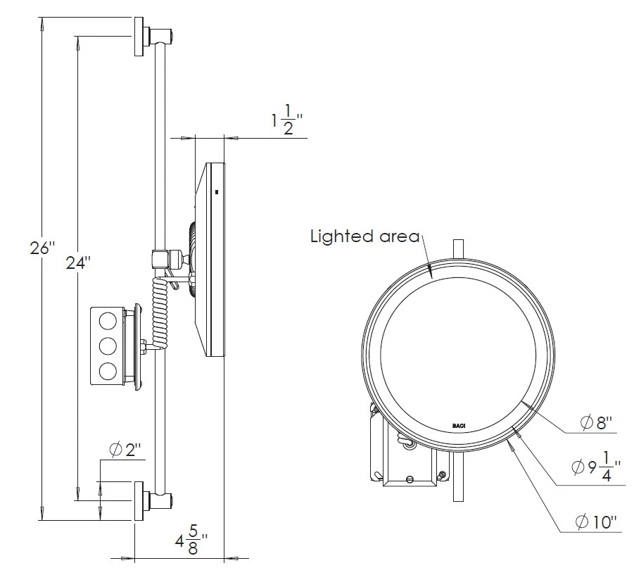 Baci Senior Slide Wall Mirror has a solid brass construction and optical quality 5x magnification glass mirror with high power natural white LED lighting. Mirror adjusts vertically 21 inch on the 26 1/8 inch high bar. Baci Senior LED Mirrors are available with an optional feature that allows the user to adjust the color of the light output from the soft warm shades of an incandescent lamp to the bright cool white of the noon sky – 2800K to 4800K. Thus you can apply your make-up to look your best in any environment from a candlelit dinner to a snowy ski run. To alter the hue of the light, simply press one of the buttons on the back of the mirror. The top button makes the color warmer and the bottom button makes it cooler. To change the light in small increments, tap the button. If you hold the button down it will change continuously as it cycles through the full extent of the range in the direction selected. When the light reaches the end of its range, press the other button to smoothly transition in the opposite direction. Do not press both buttons at the same time.Finishes in Satin Nickel, Polished Nickel, Bronze, Polished Brass, or Polished Chrome. Damp location rated. UL listed.