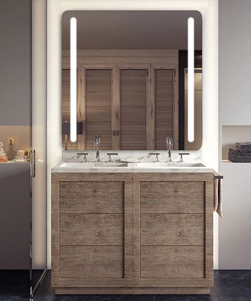 The Bela Lighted Mirror features a smooth polished edge and rounded bands of light. Copper-free, corrosion resistant DuraMirror glass with forward facing 3000K color temperature task lighting. Forward phase dimming.