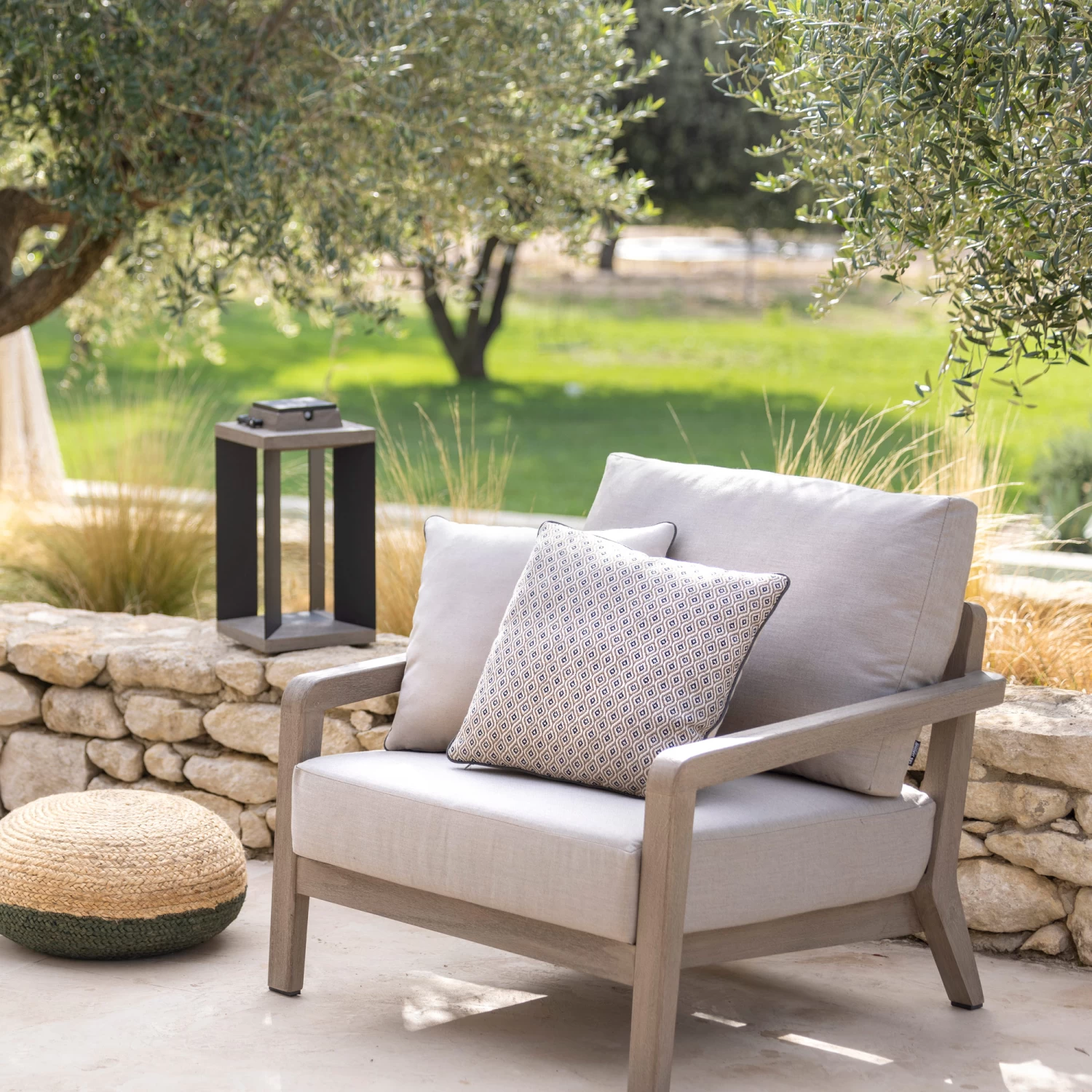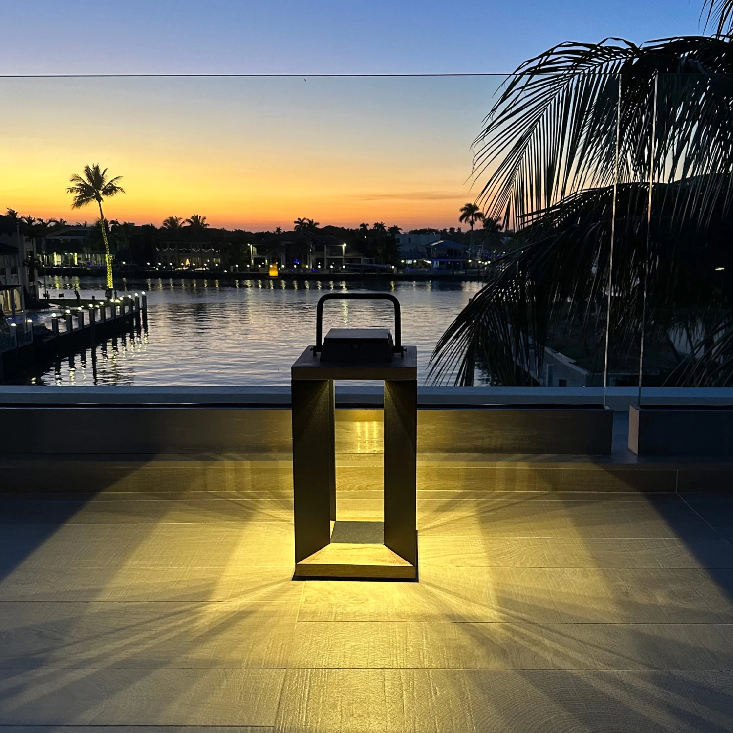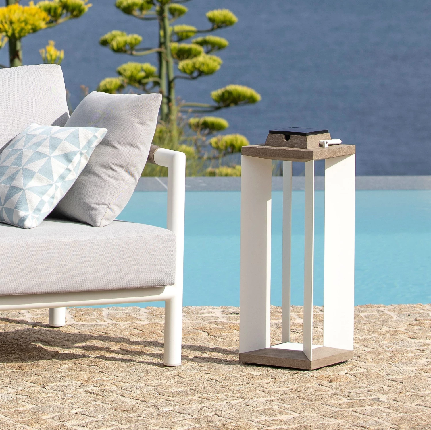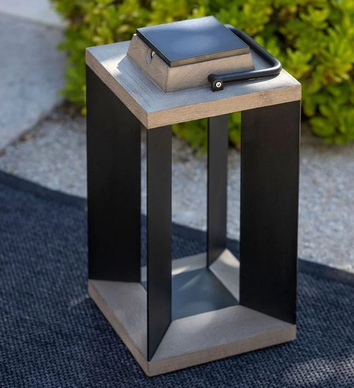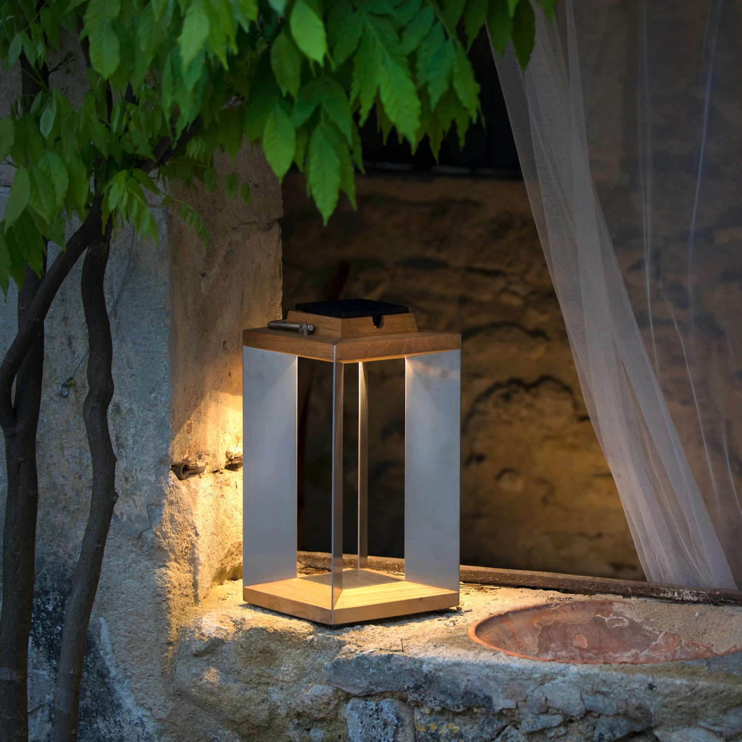 The Blade Outdoor Solar Lantern combines sleek metal blades with the warmness of teakwood for a unique, contemporary take on lantern design. The blades are made of stainless steel, or black or white powder coated aluminum. This convenient, portable light can illuminate outdoor spaces including lounges, dining areas and pathways.
