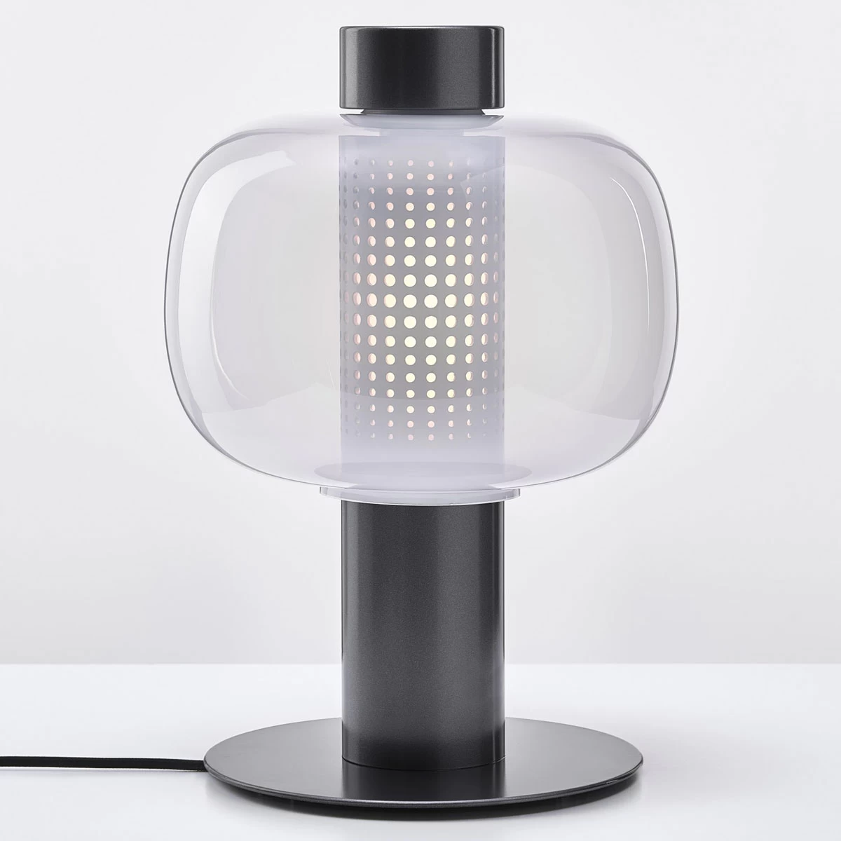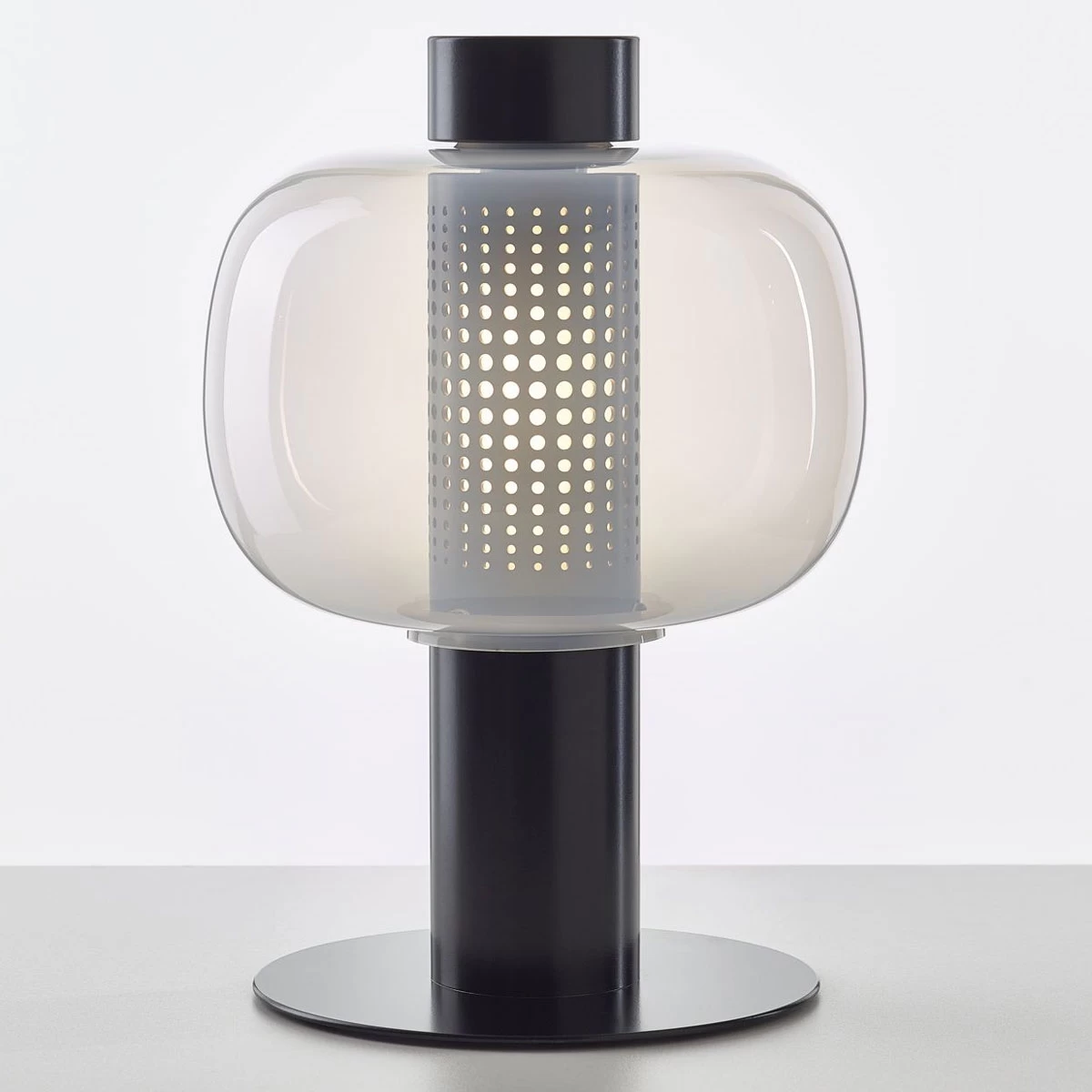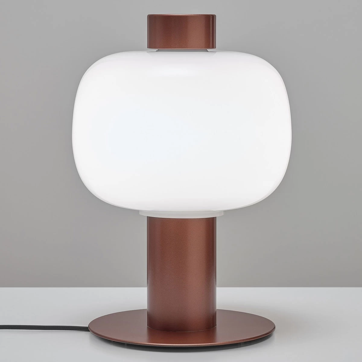 The Bonbori Outdoor Table Lamp was inspired by the traditional paper lamps in Japan. Bonbori not only denotes this form of lighting, but also describes the soft light from within a snowy cave. Available in two sizes. Glass shade available in Transparent Opaline or triplex Opal with finish in Matte Metallic Copper, Matte Metallic Grey, or Matte Black with a Black or Light Grey 7.8 foot textile cord. On/off switch on cord. CE listed. Suitable for outdoor damp locations.