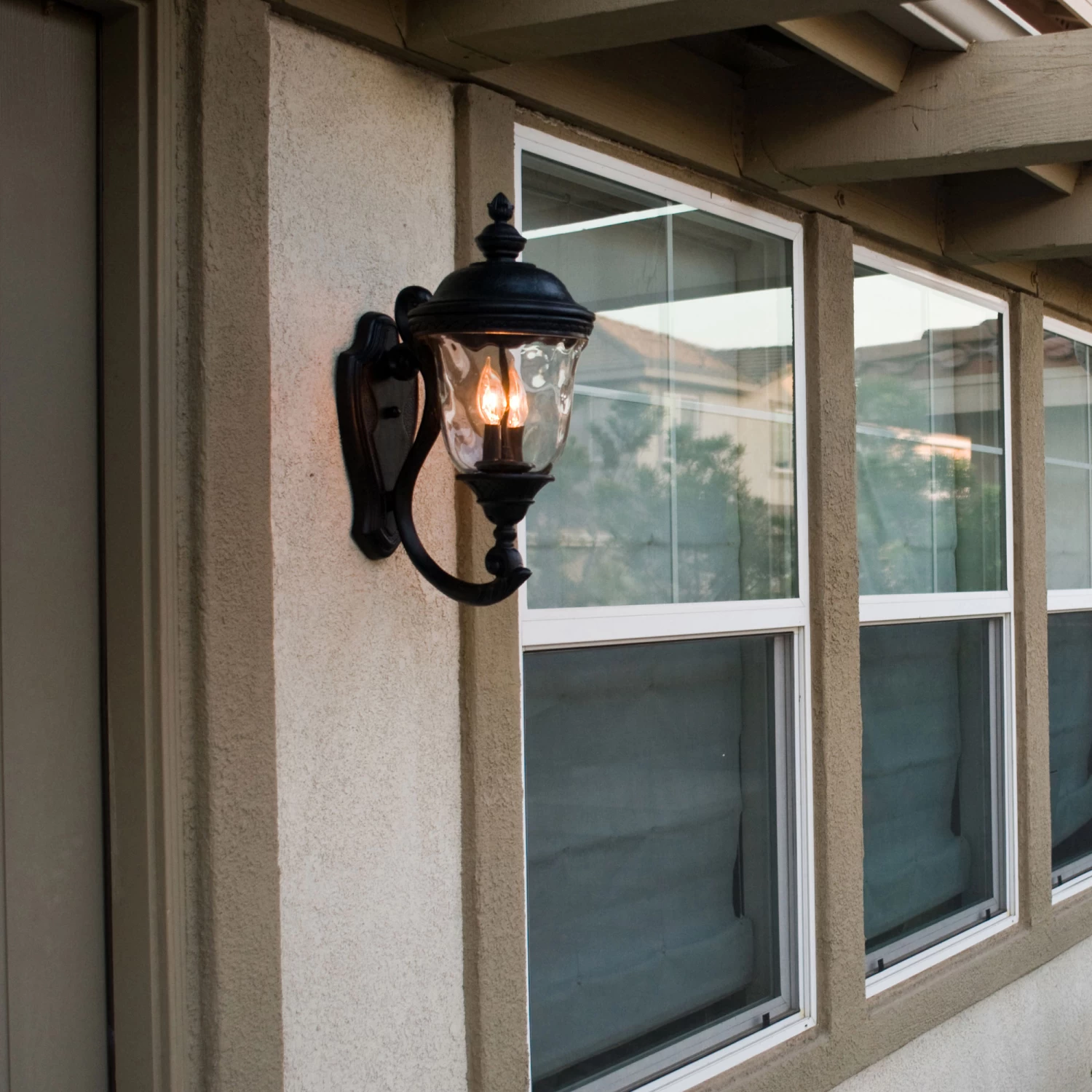 Carriage House VX Outdoor Wall Light is made with Vivex, a material twice the strength of resin, is non-corrosive, UV resistant and backed with a 3-Year Limited Warranty. Features Oriental Bronze finish and Water Glass. Available in small, medium, and large sizes. 40 watt, 120 volt B10 Candelabra base incandescent bulbs are required, but not included. Wet location rated. Small: 9 inch width x 20 inch height x 12.5 inch depth. Medium: 12.5 inch width x 26.5 inch height x 15.5 inch depth. Large: 14 inch width x 31 inch height x 18.5 inch depth.