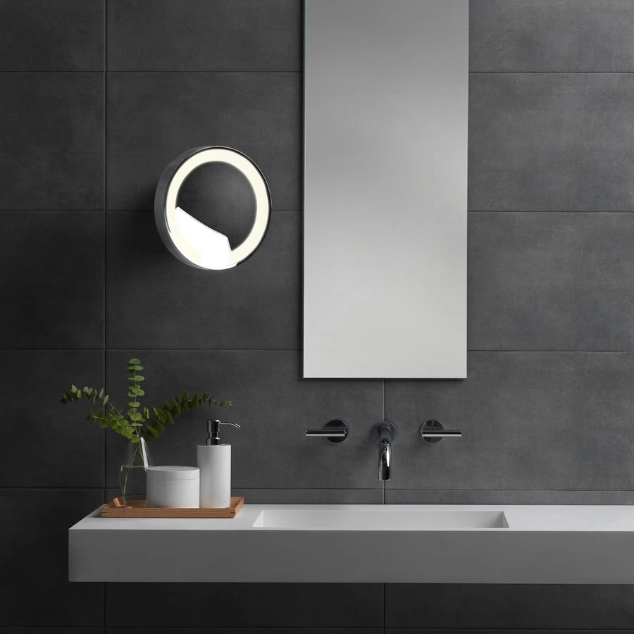 The Catena LED Lighted Mirror features a 120 volt integrated LED strip and 5x magnification. Polished Chrome finish. Tilt adjustable angle 90 degrees. Rotation adjustable angle 180 degrees. No driver required. Mounts to a 4 inch octagon box (.5 inch stub mount). Includes an on/off switch on backplate. Suitable for damp locations. UL listed.