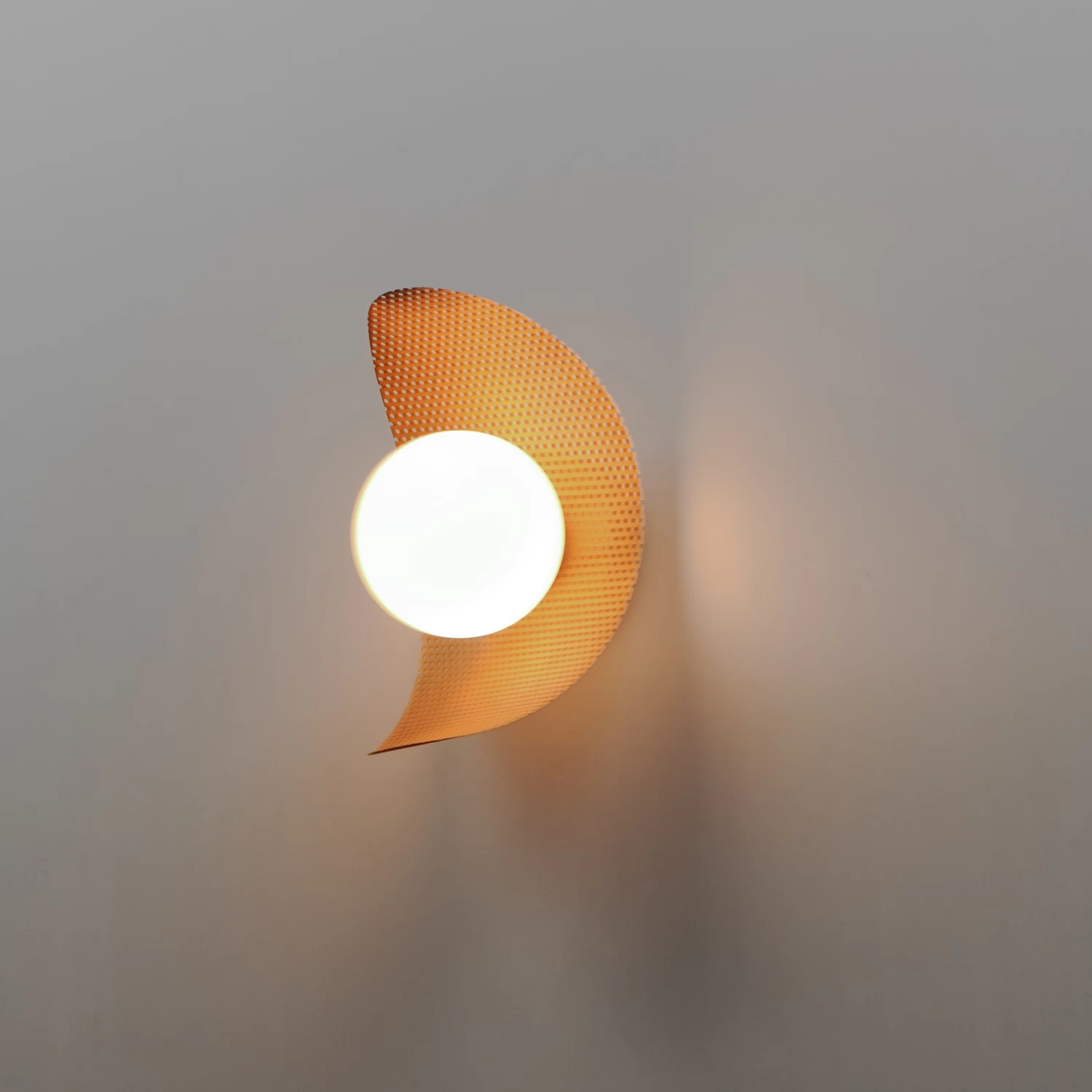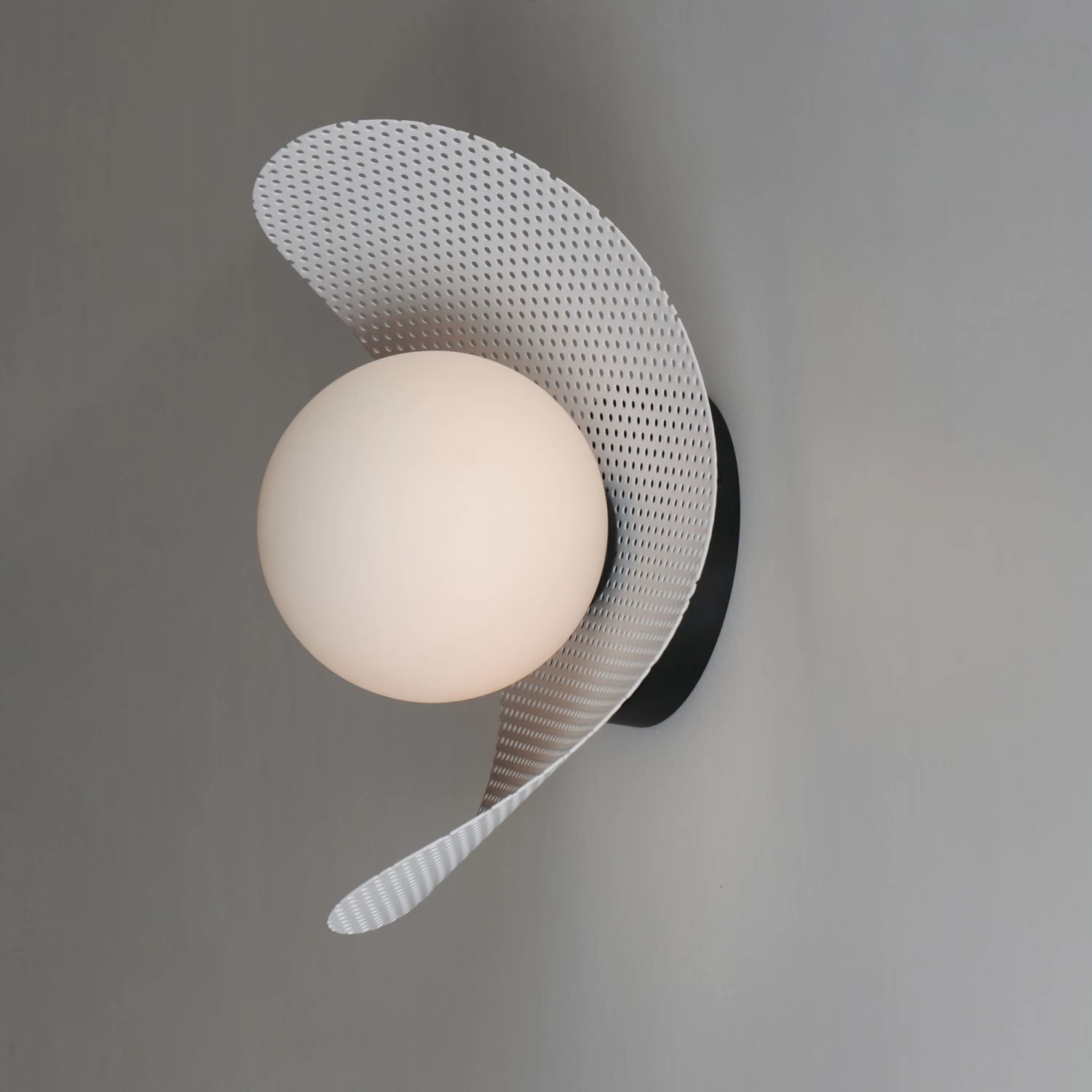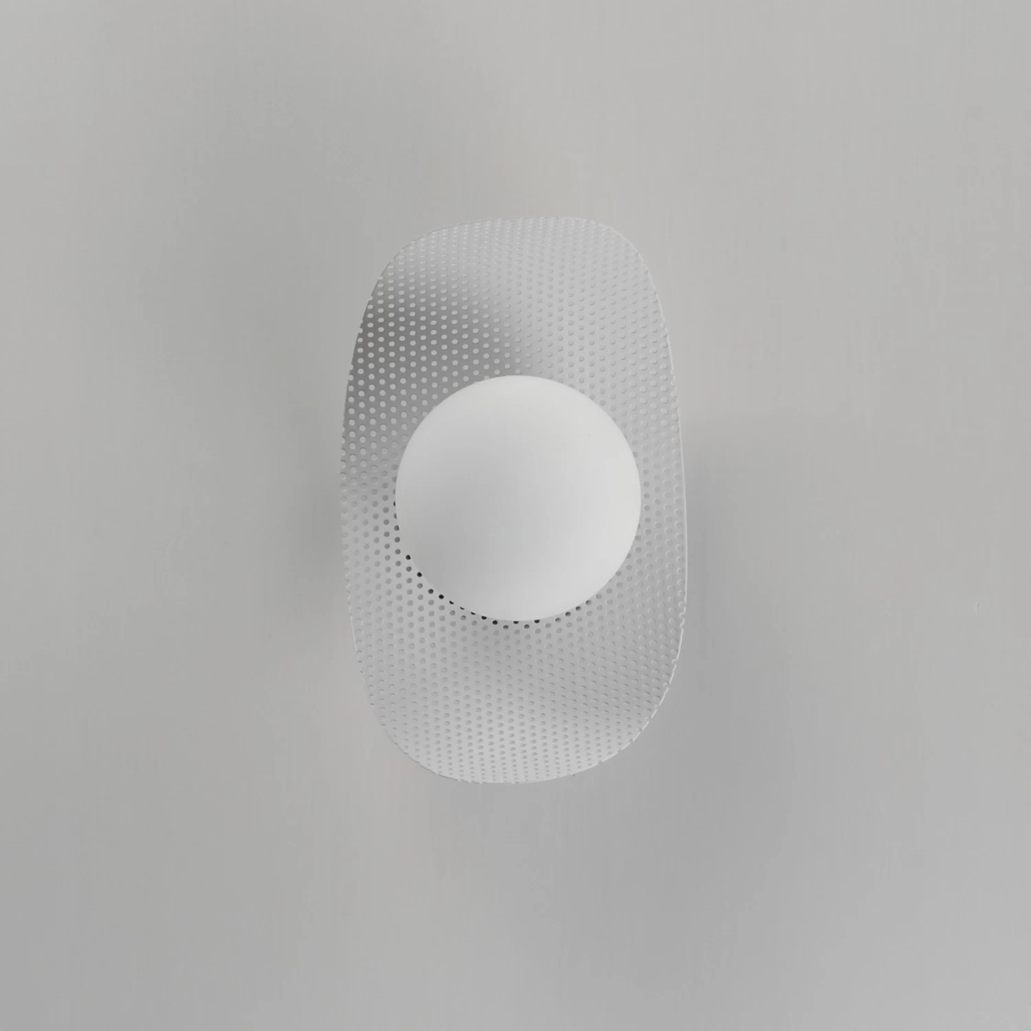The Chips Wall Sconce features a glass LED globe set on a curved perforated metal sheet shaped like a chip. Influenced by pop art and sculpture, this airy design brings unique modern character as it illuminates your space.