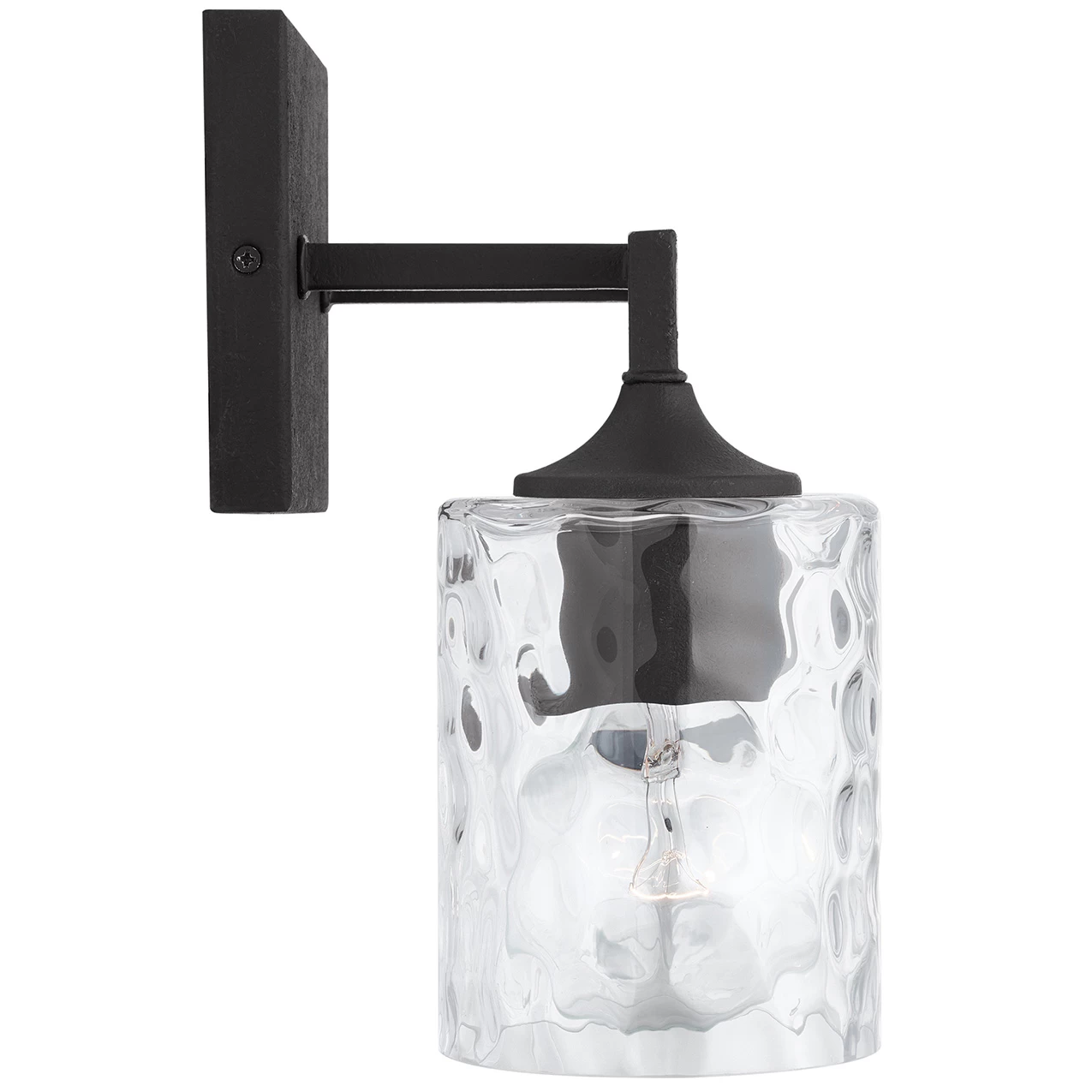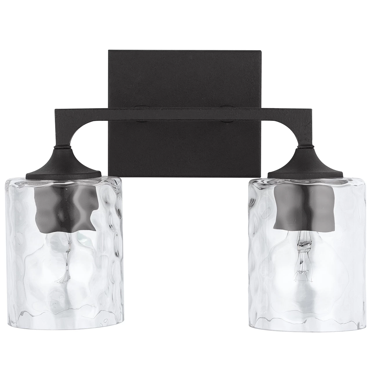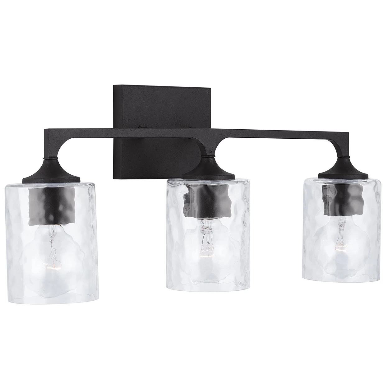 The Clint Bathroom Vanity Light brings understated elegance with clean simple lines to a variety of interior spaces. The Clear Water glass shades and Black Iron finish brings a bold light to your room. Canopy: 5 inch diameter. UL listed.