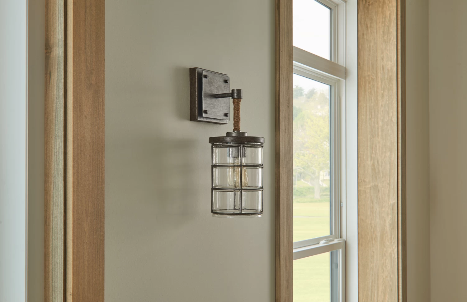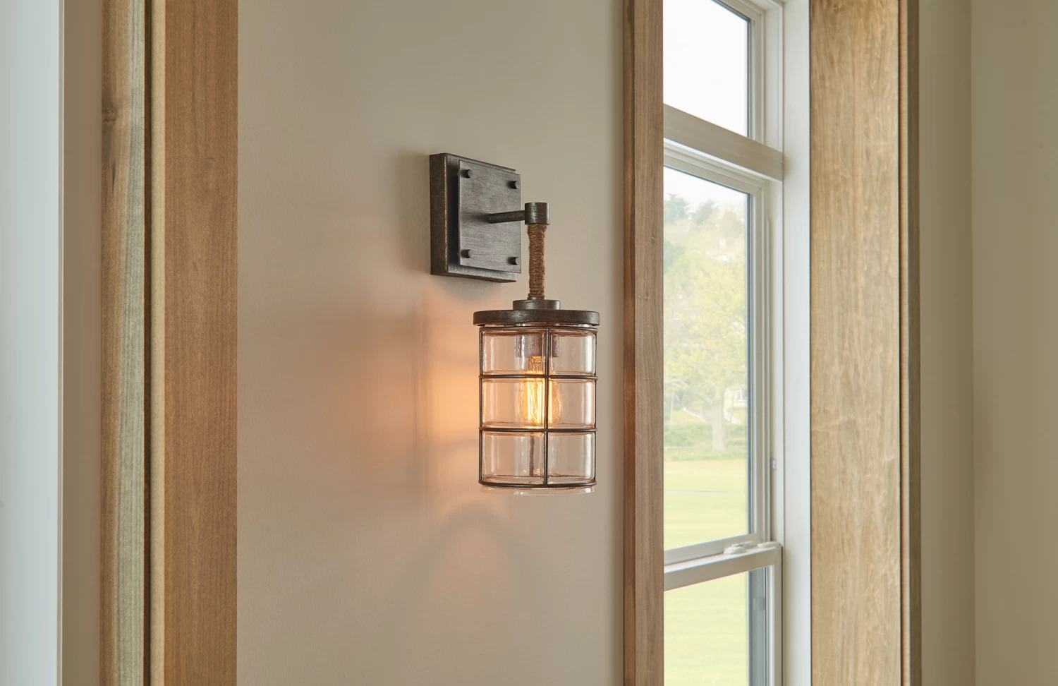 The Cobly Wall Sconce offers a sleek look with a contemporary. industrial and coastal vibe. Features one light sconce with Urban Grey finish and Clear blown glass. Includes decorative rope accent. UL listed. Suitable for damp locations.