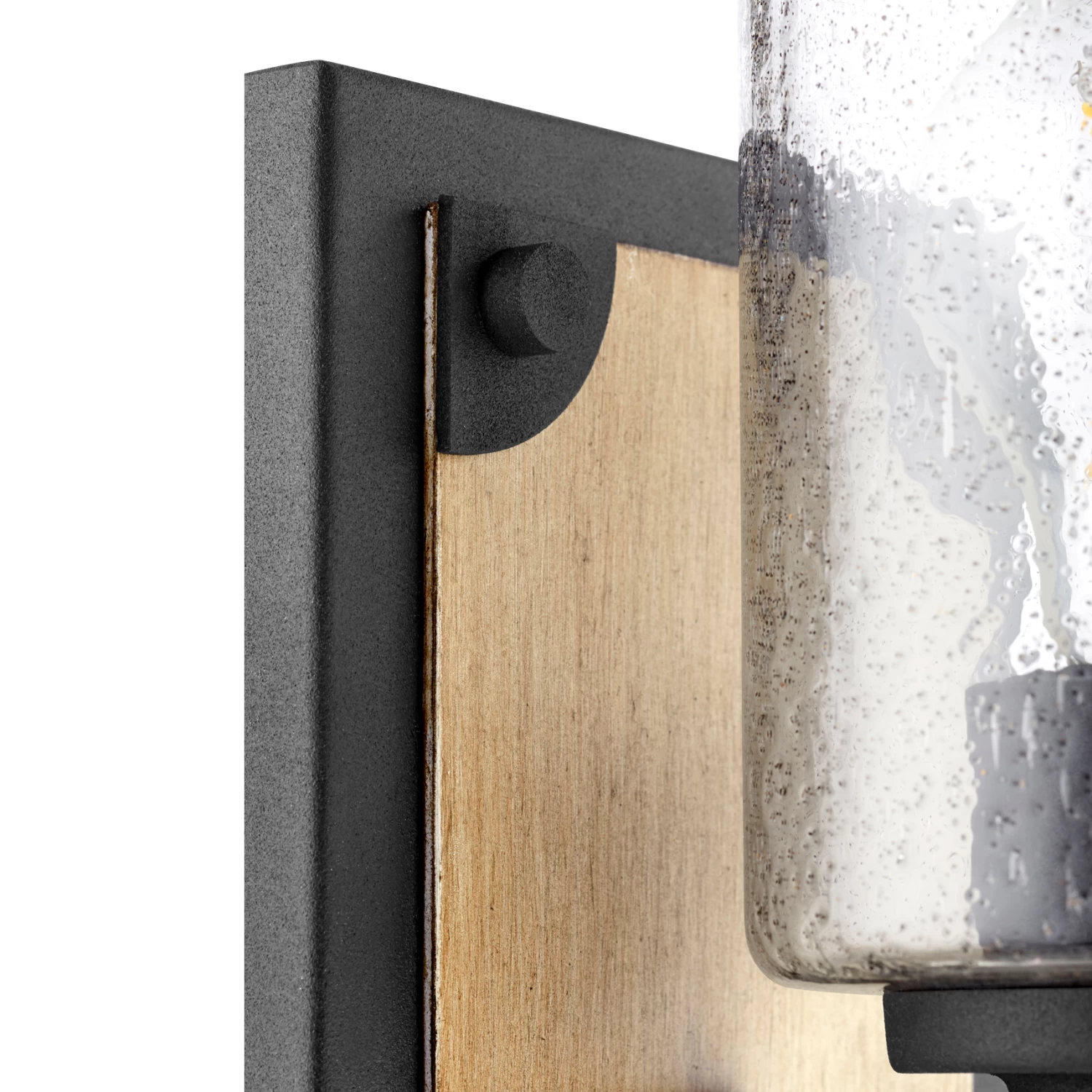 This Corner Bracket 1-Light Wall Sconce features a Noir framed finished with a Driftwood inlay coupled with a round Peppered Glass shade for an attractive industrial farmhouse feel.