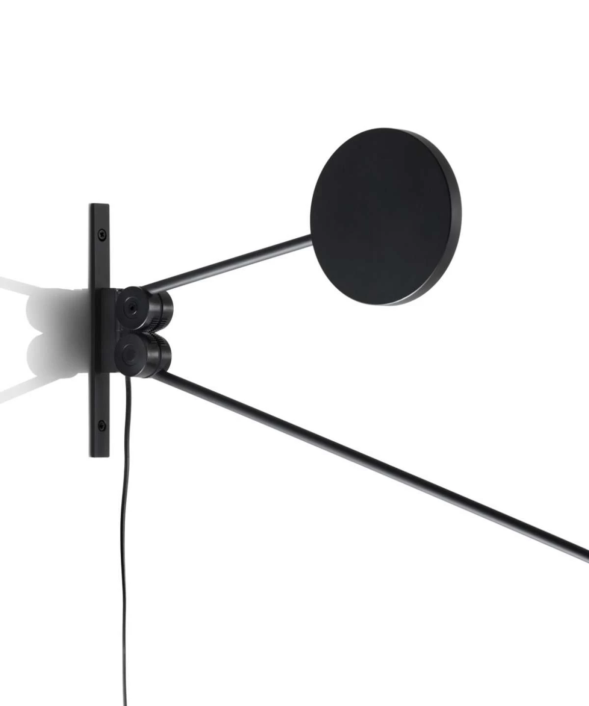 The Counterbalance Plug-in Wall Light seems to defy the laws of physics. Positioned as desired in space, this piece, with its position variation, suggests the dynamic equilibrium of a sculptural mobile. Equipped with a fluid balancing system using gear wheels, the counterweight compensates for the movements of the long arm and ensures stability of the diffuser. Structure in painted steel and head in aluminum in Black finish. Includes step dimmer (0/50/100%).