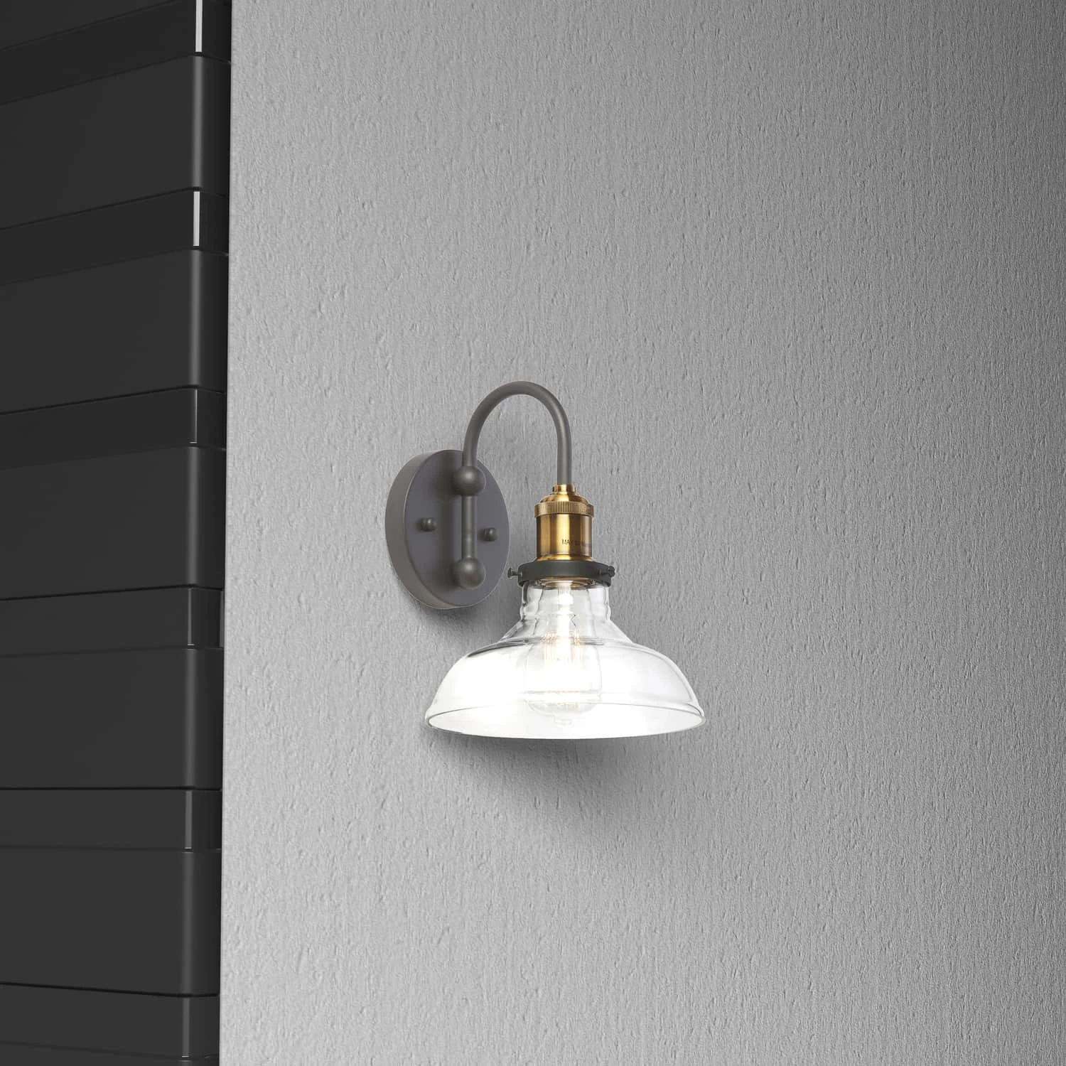 The 408 Wall Sconce features a bowl shaped clear glass shade and curved arm mounted on a round backplate. Black and Antique Brass finishes add contrast and a touch of industrial style that complements a variety of interior styles.