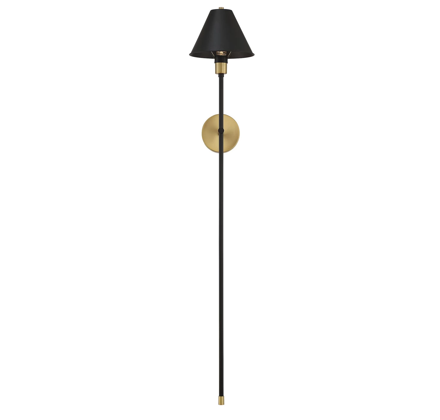 The Danielle Plug-in Wall Sconce brings a midcentury modern look to your interior space. The long stem hold a cone shaped shade casting warm shadows across your room. May be hardwired.
