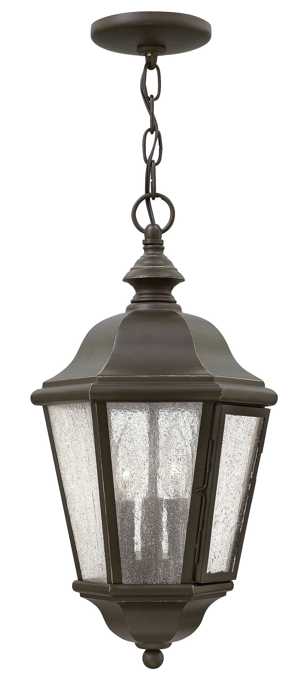 The Edgewater 120V Outdoor Pendant features an Oil Rubbed Bronze or Black finish with Clear Seedy glass.