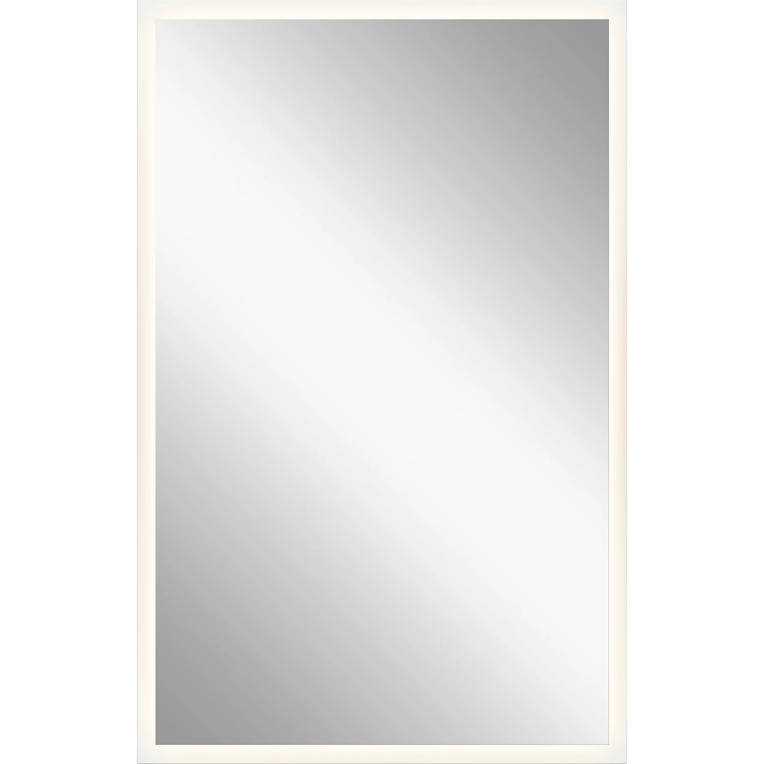 Mirror With 2 inch Etched Acrylic Border features light emanating from behind the mirror, creating a soft illumination through the etched light edge. 6 inch diameter round magnifier mirror included which easily suctions to the mirror for close-up applications. 39 inch width x 25 inch height x 1 inch depth. Mounts vertically or horizontally. ETL listed for damp locations.