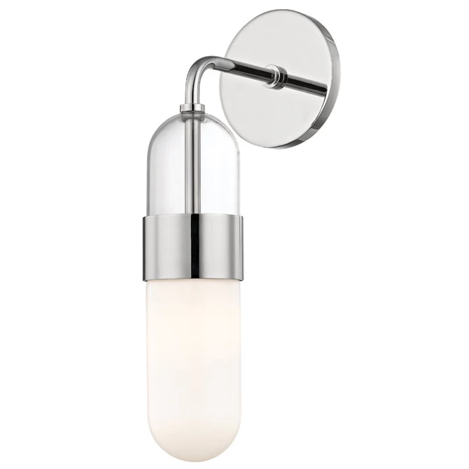 The Emilia Wall Light features a Polished Nickel or Aged Brass finish with a Clear and Frosted glass shade. UL listed for damp locations.