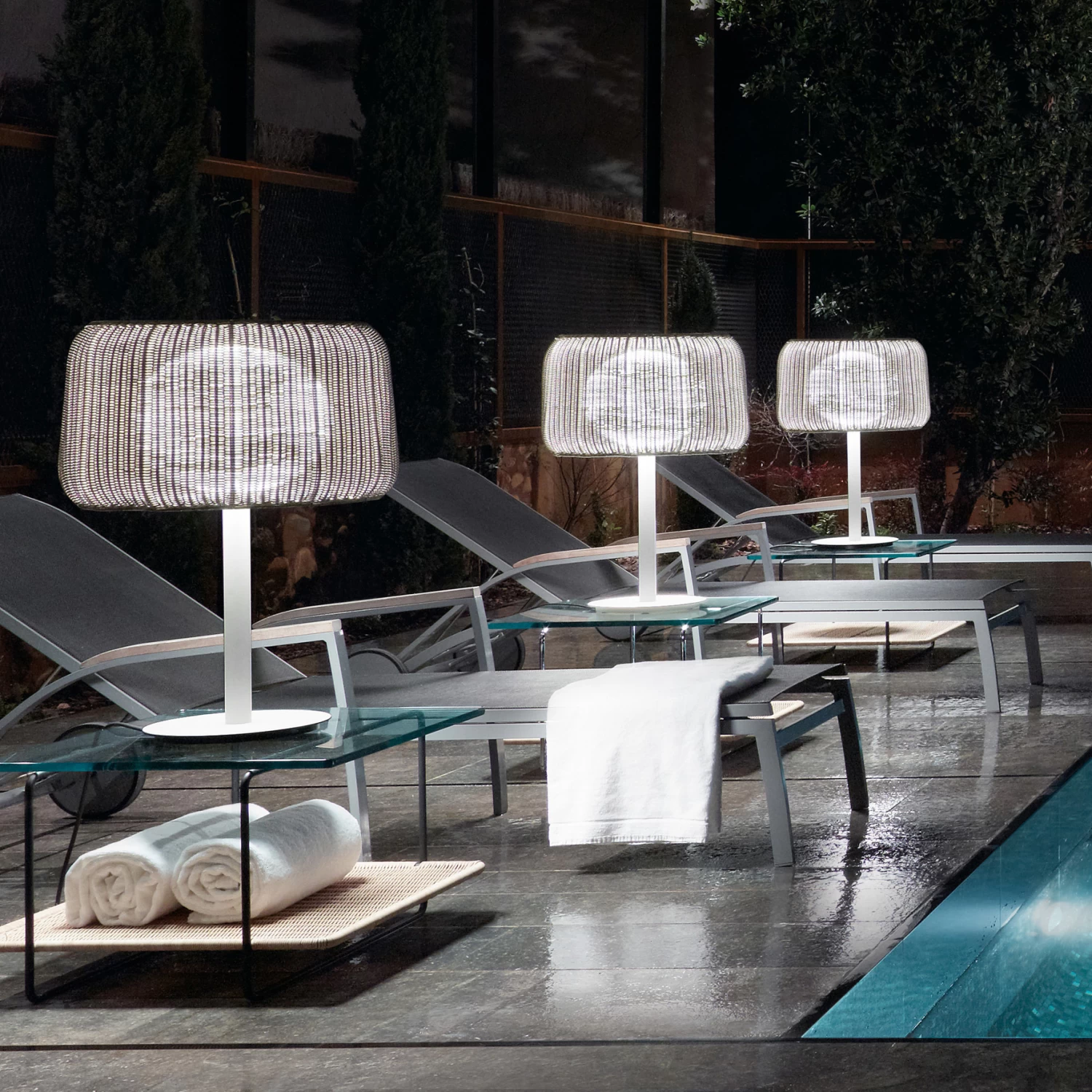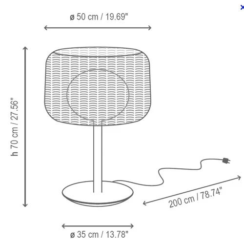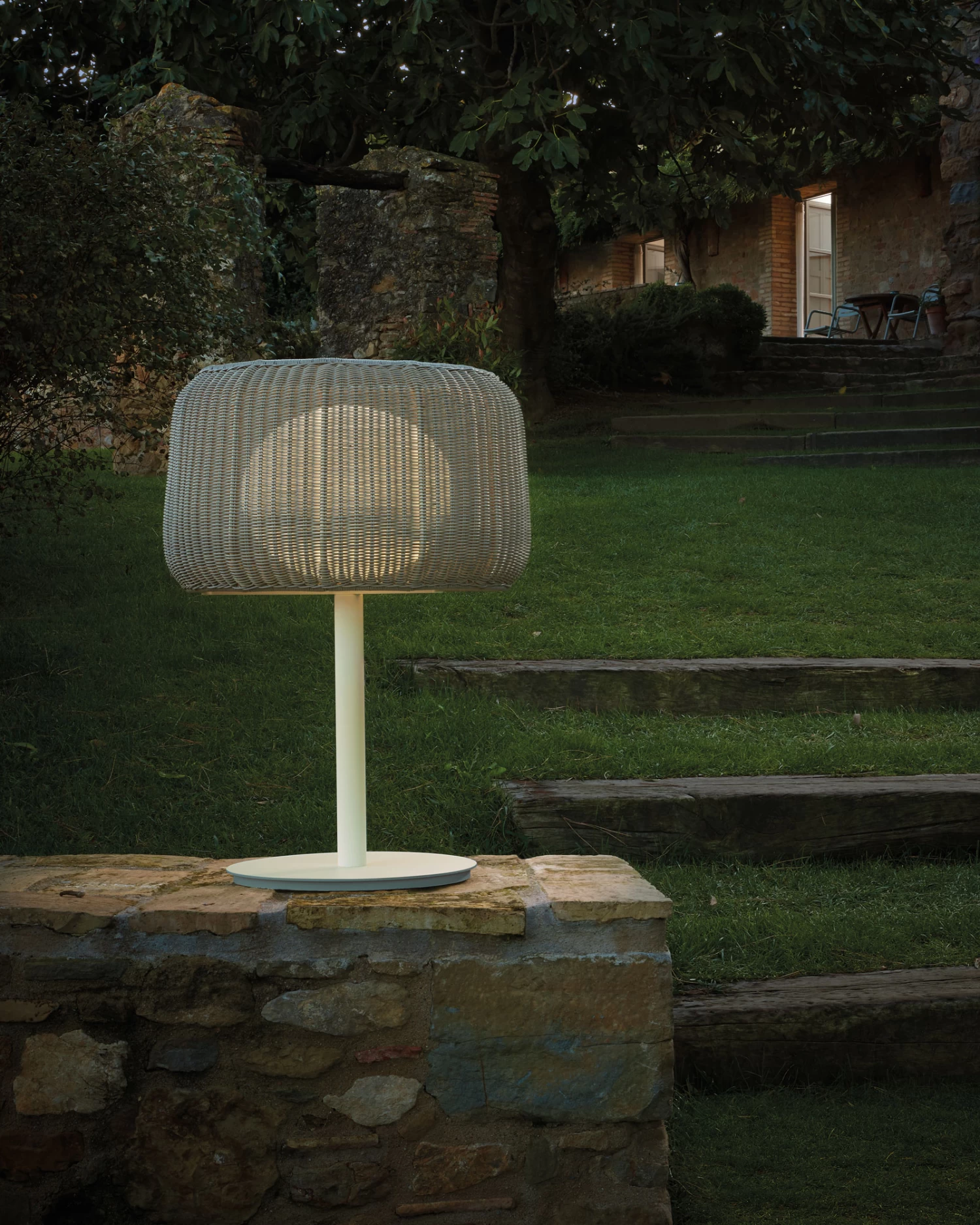 The Fora Outdoor Table Lamp features a cast iron base with a synthetic fiber shade making it highly resistant to weathering while casting a pleasant, diffused light. Available with a Light Beige fiber shade and a Natural White base or a Brown fiber shade and a Graphite Brown base. Black waterproof neoprene cable without switch.