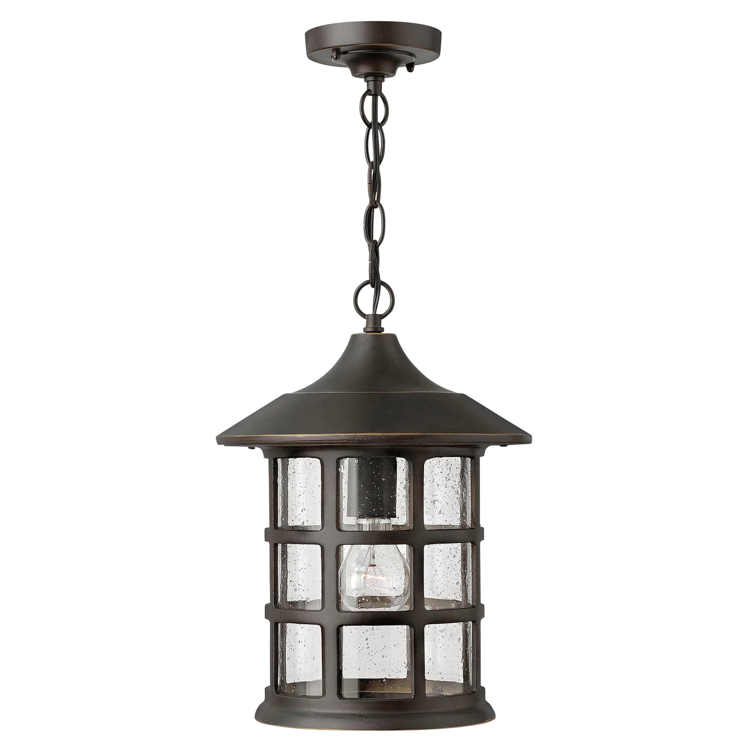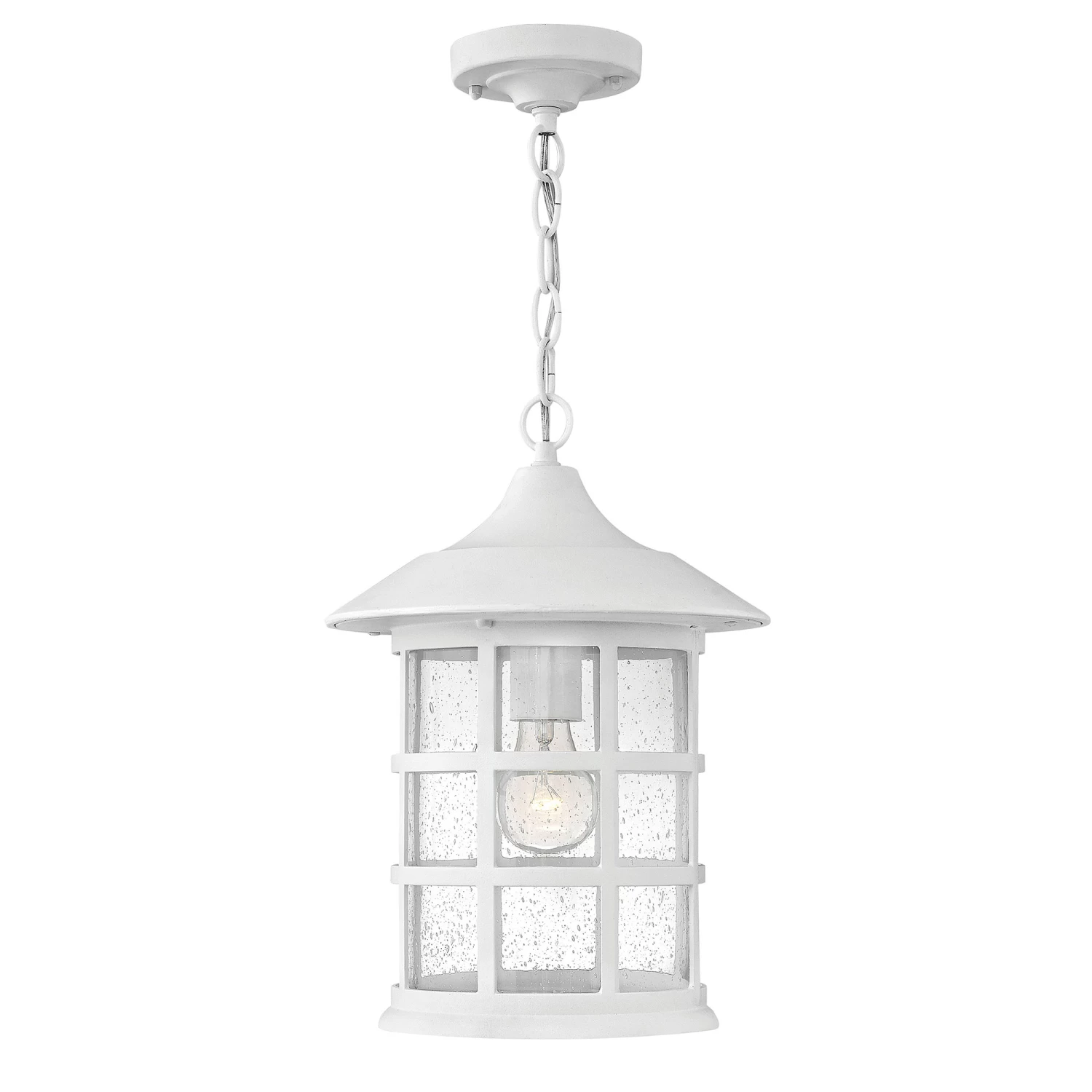 The Freeport Outdoor Pendant features cast aluminum construction in Black, Classic White, or Oil Rubbed Bronze finish with Clear Seedy Glass or an Olde Penny finish with Etched Seedy Glass. Canopy: 4.25 inch diameter. UL listed for damp locations.