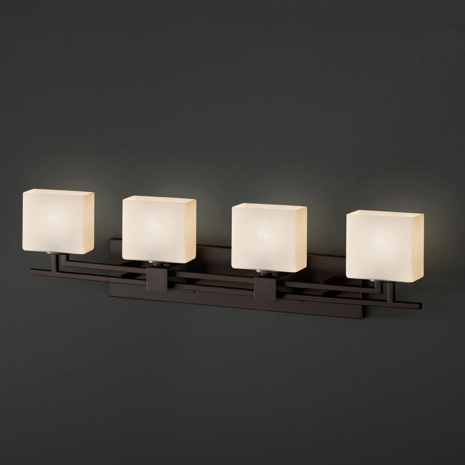 The Fusion Aero 4LT Rect Bathroom Vanity Light brings a clean simple look to your interior space. The clean artisan glass casts warm shadows across your room. May be mounted up or down.
