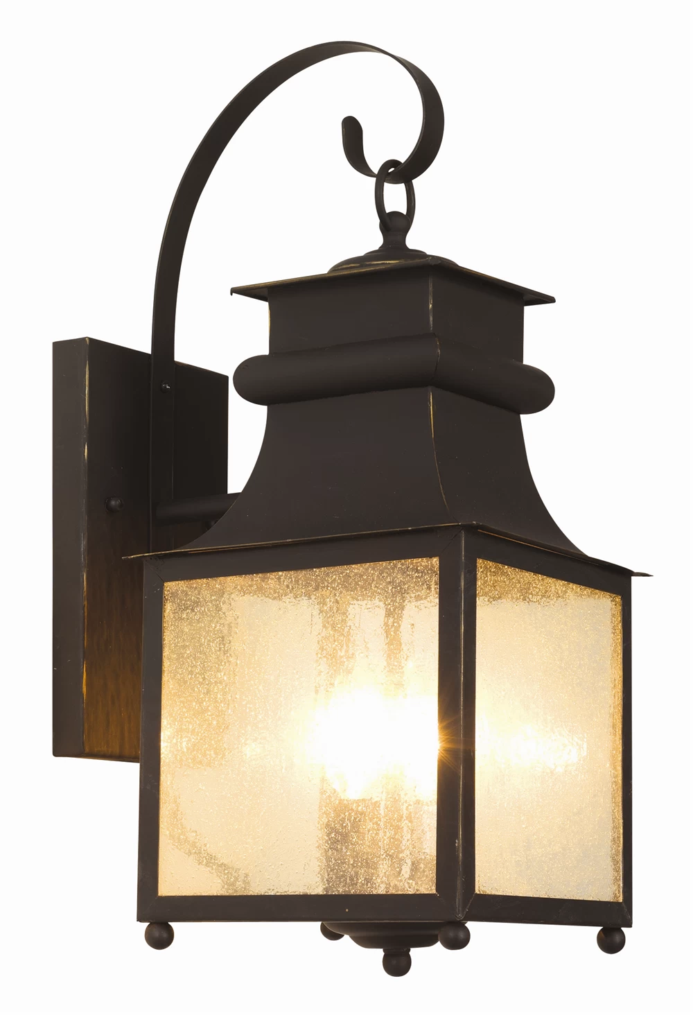 Garden Chimney Outdoor Wall Light features Seeded glass with a Weathered Bronze finish. Available in small, medium, and large sizes. Wet location rated. Small: One 100 watt, 120 volt A19 type Medium base incandescent bulb is required, but not included. 6 inch width x 14 inch height x 8 inch depth. Medium and Large: 60 watt, 120 volt B10 type Candelabra base incandescent bulbs are required, but not included. Medium: 8 inch width x 18 inch height x 10.5 inch depth. Large: 10 inch width x 24.5 inch height x 13.5 inch depth.