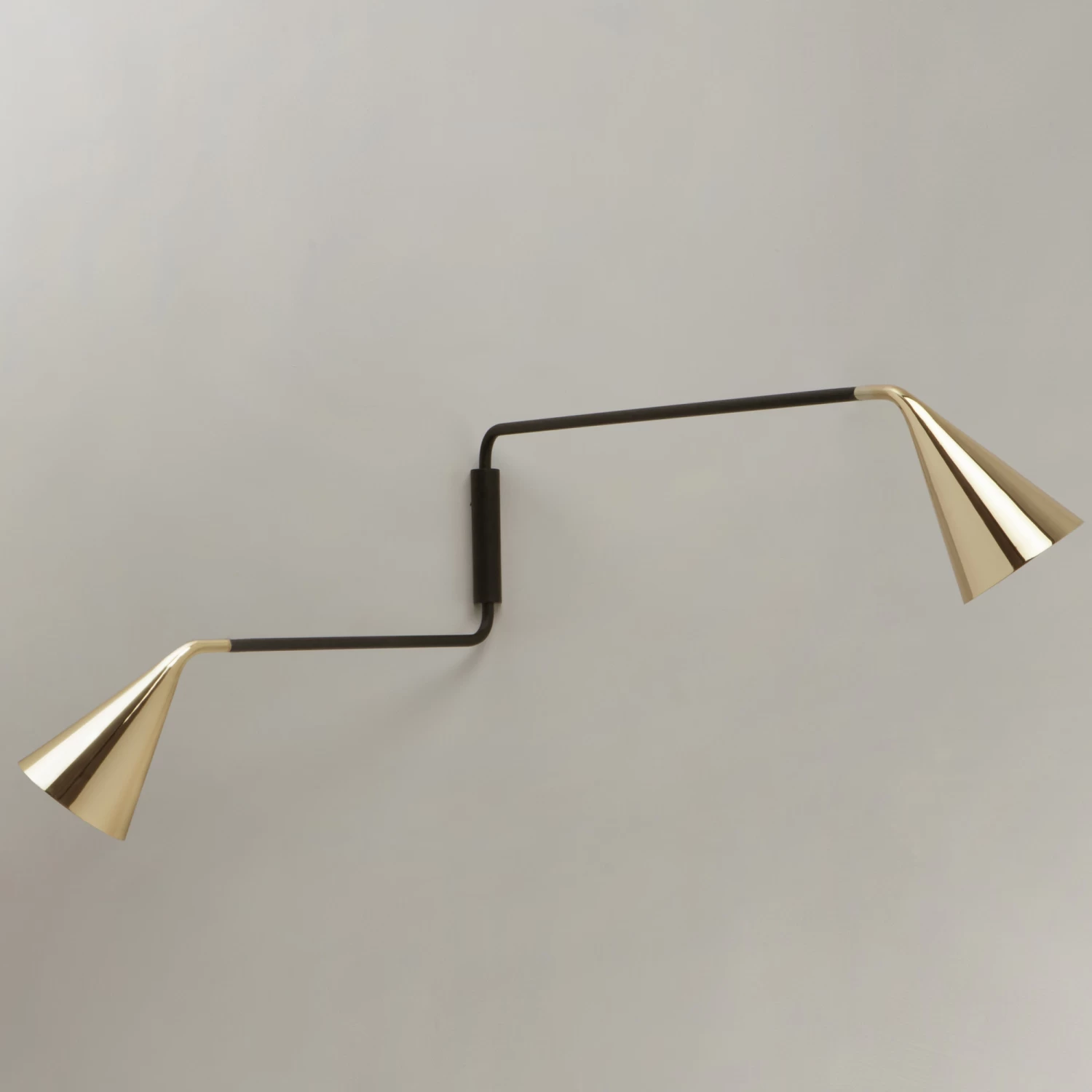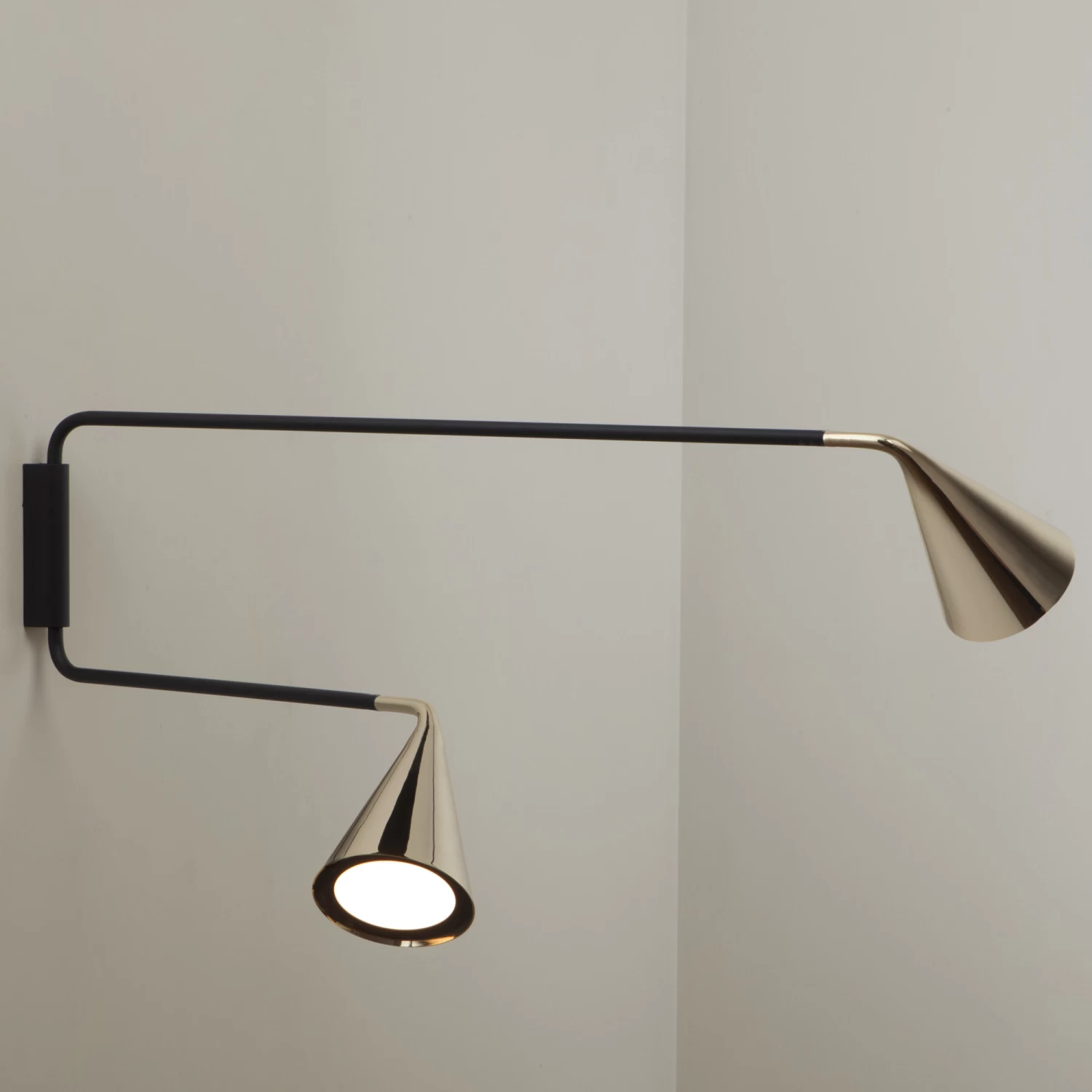 The Gordon Double Wall Sconce has a formal and material interpretation of the conical diffuser that is the main feature of the Gordon product line from Tooy. Two adjustable cones extend from the Gordon’s centerpoint and provide ample lighting for both tasks and ambience. Adjustable direct light 270 degrees. Available with a Matte Black finish complemented by a Black, Polished Gold, Black Chrome, or Brushed Brass colored shade. Includes cord and plug. CE Listed.