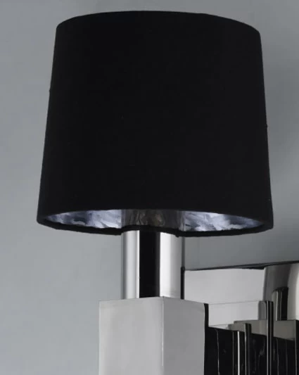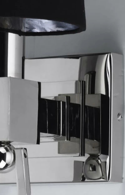 Jefferson Wall Light is a modern interpretation of 18th Century design, combining various simple geometries – a cube attached to a ring with suspended stirrup from a sphere all finished in Polished Silver with a coordinating Black shade with our signature Metallic Silver Patterned liner.
