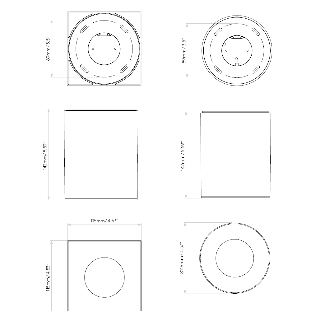 The Kos Round or Square Surface Mount Downlight features aluminum construction in Textured White or Textured Black finish. Available with 2700K or 3000K color temperature. Mounts to a standard 4 inch octagon box. No LED driver required. ETL listed. Suitable for wet locations. Dimmable with leading/trailing edge dimmers, sold separately. NOTE: Black Round option in 3000K is no longer available.