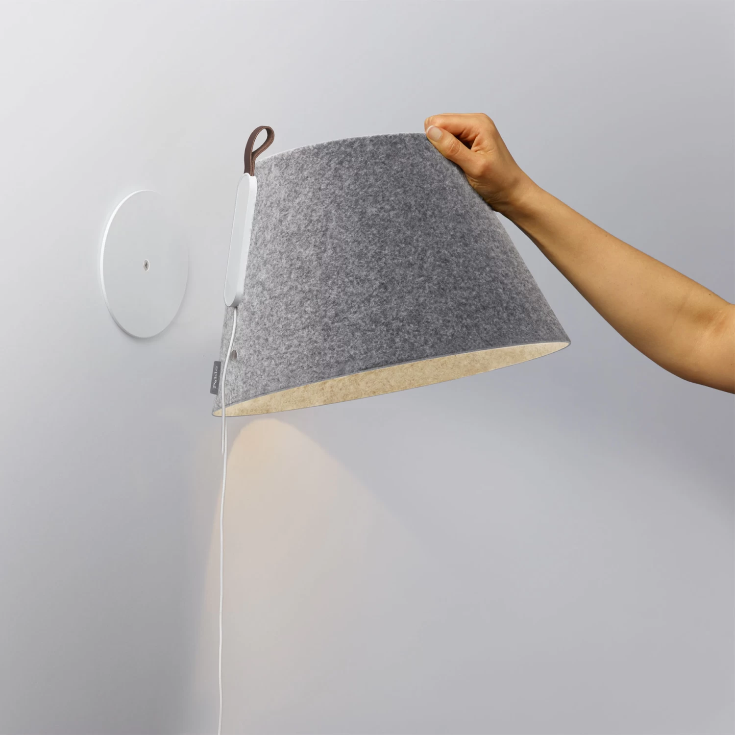 The Lana Plug In Wall Light is inspired by a fusion of craft and advanced manufacturing. Features a handcrafted 100% wool felt shade paired with state of the art LED technology. Includes premium leather strap for easy adjustment. LED module employs neodymium magnets allowing for effortless attachment with 360 degree shade rotation, and optical switch with full range dimming. Available in three sizes. On/Off switch is located inside the shade. ETL and CE listed.