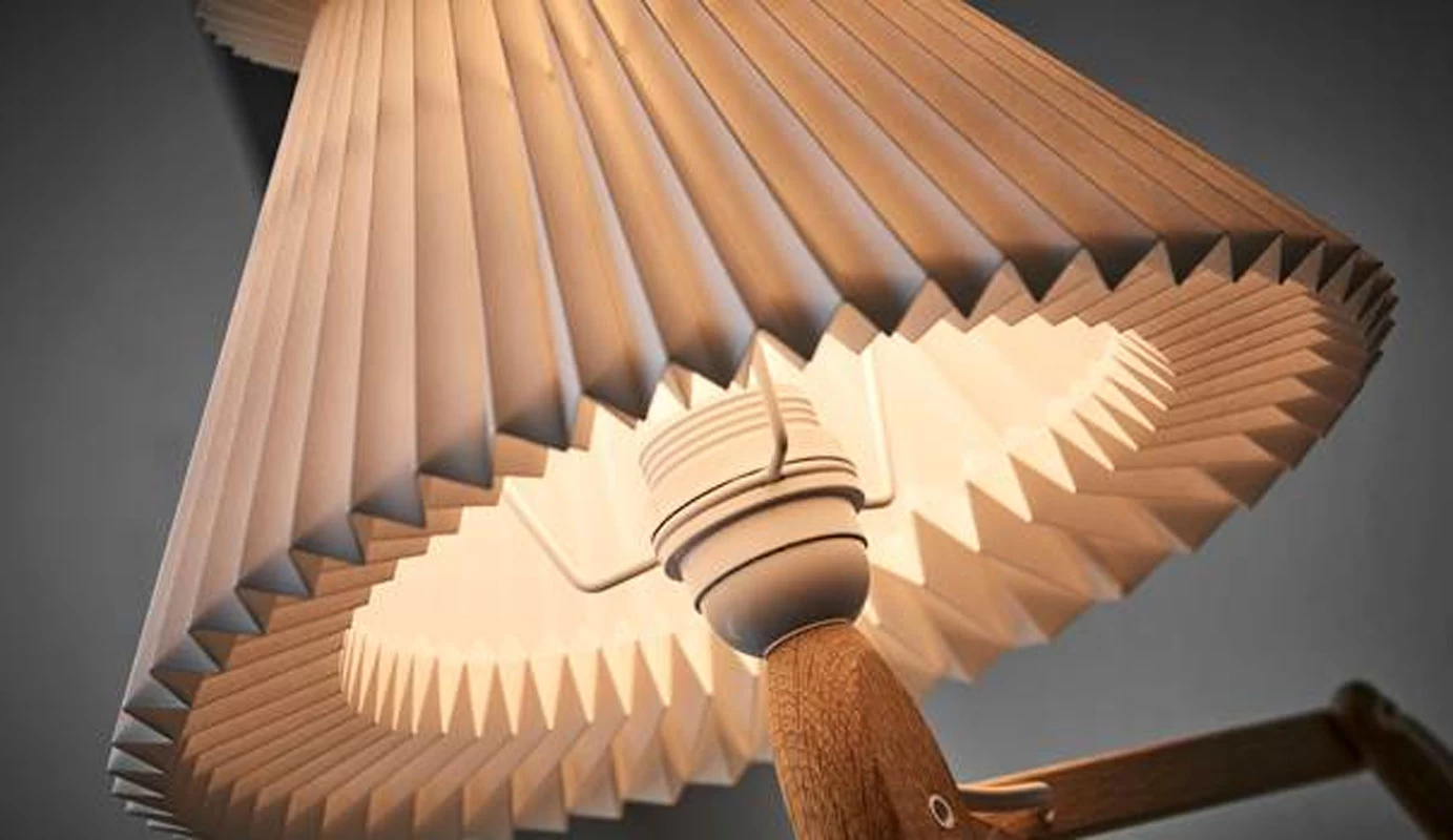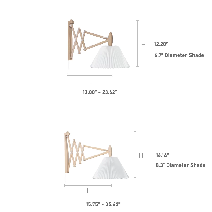 The Sax Flexible Wall Lamp, designed in 1952 by Erik Hansen, is a classic design featuring a Light Oak wood frame with a White PVC pleated tapered shade. General downlight distribution. Available in two sizes with a flexible arm offering a minimum/maximum arm reach. Includes cord and plug with on/off switch.