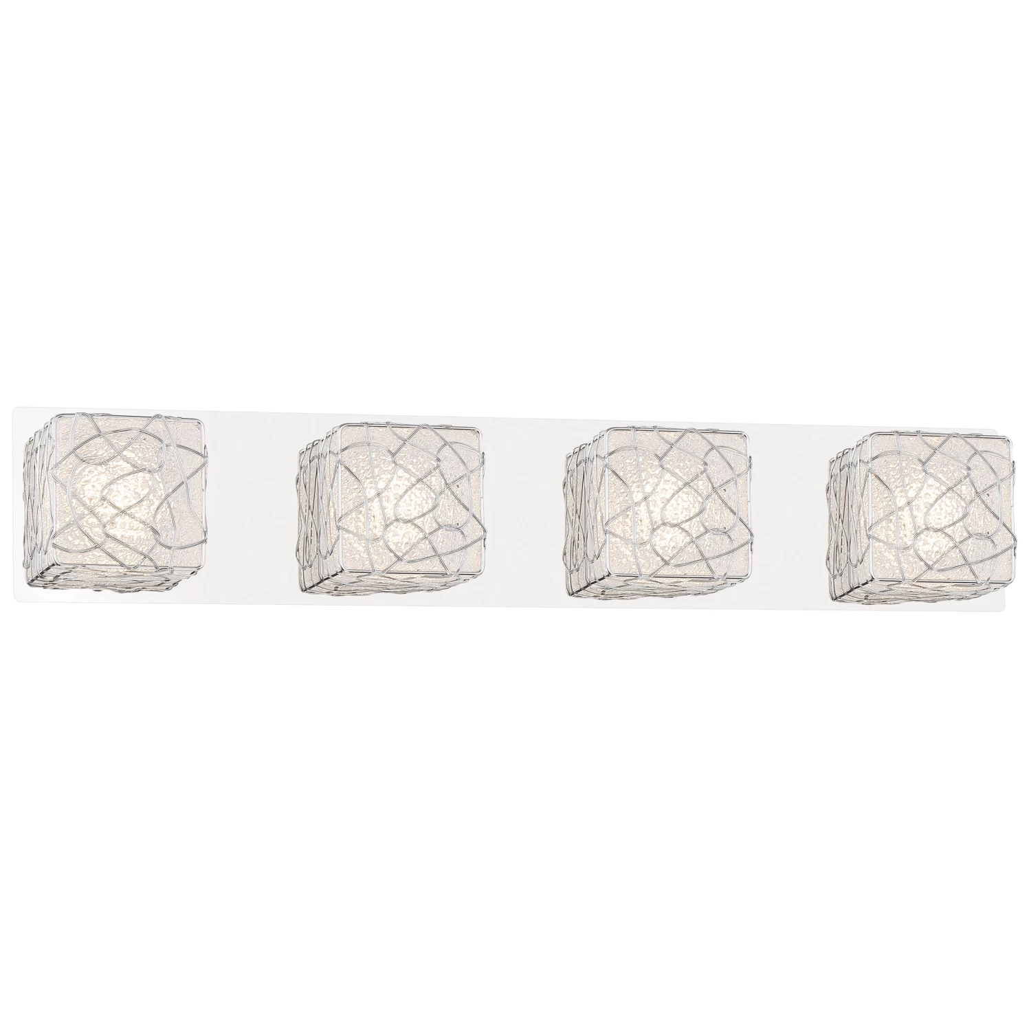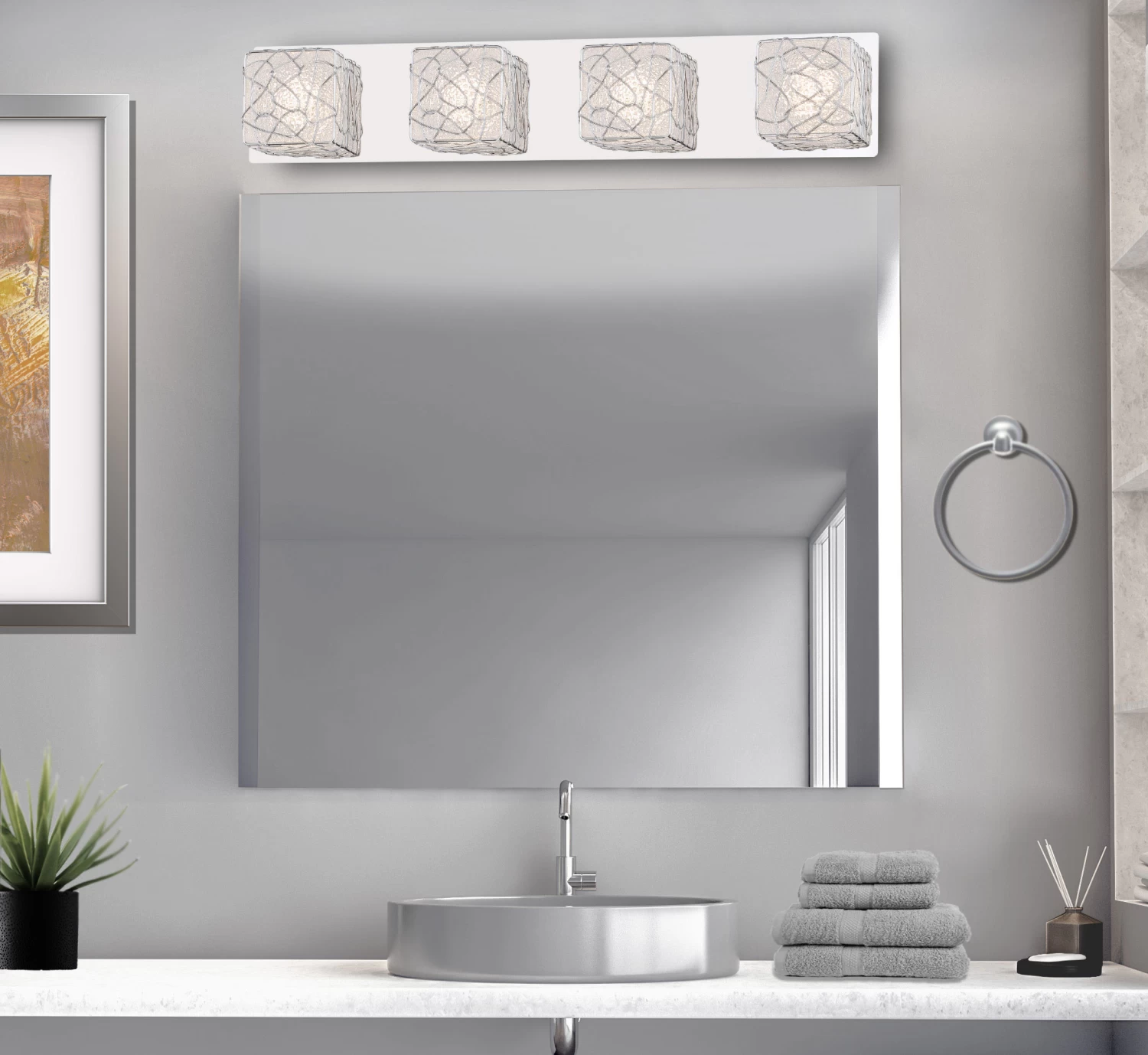 The Livewire Bathroom Vanity Light will add a striking accent to a bathroom vanity with a row of textured square shades. The plastic shades feature a rough texture reminiscent of molded glass to diffuse light from the integrated LED lamps. Chrome cages around the shades add another layer of texture. The look is completed with a rectangular chrome backplate for a sleek, modern expression.