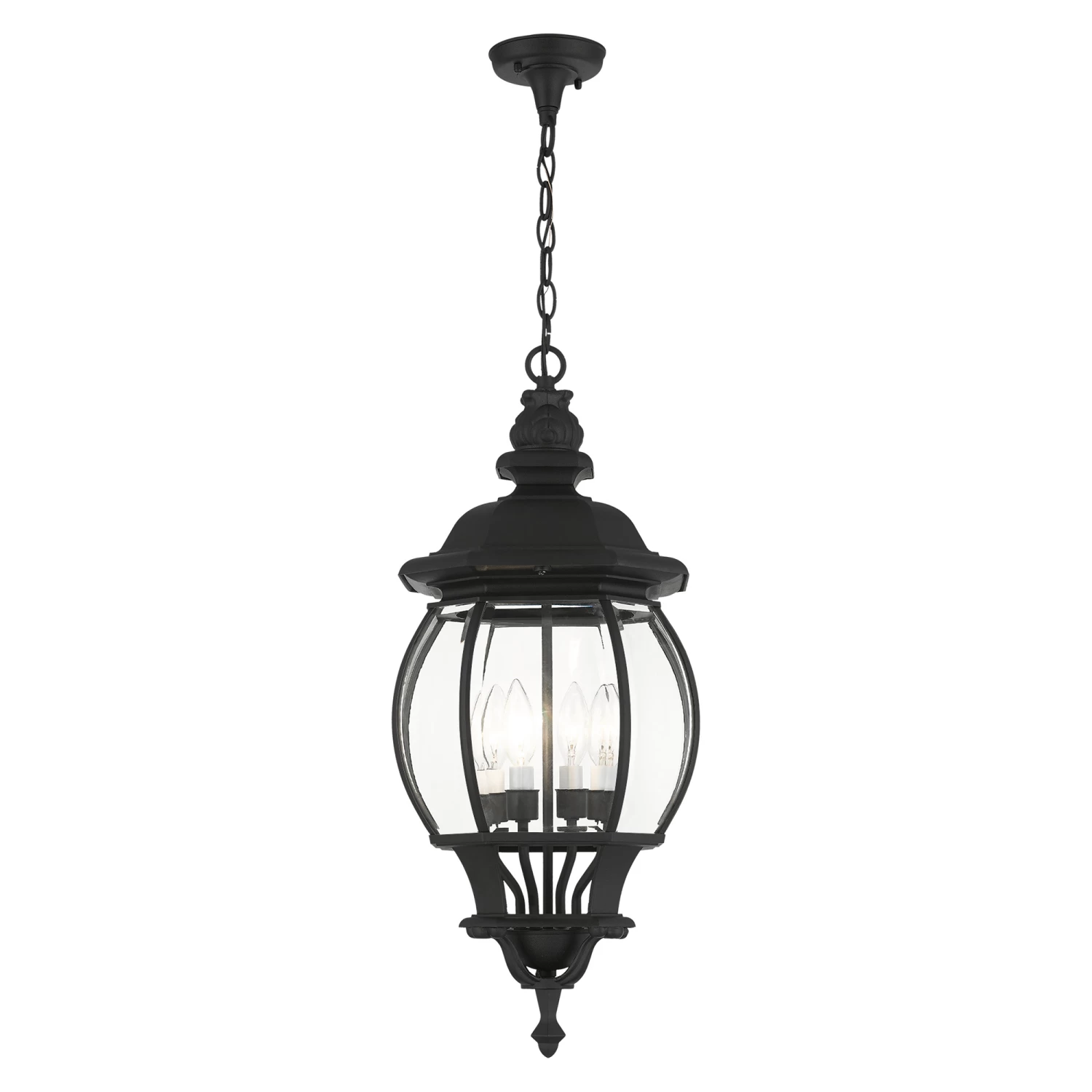 The Frontenac Outdoor Pendant is inspired by traditional lanterns that blend perfectly in any exterior space. Features Clear beveled glass with a Textured Black finish and is available in two sizes. Canopy: 4.25 inch diameter. Damp location rated. UL listed.