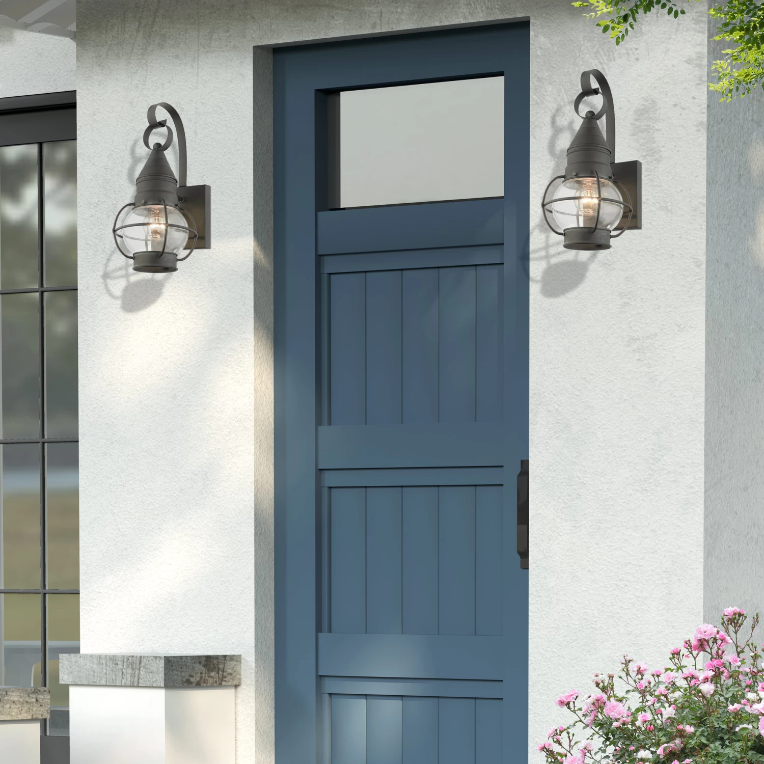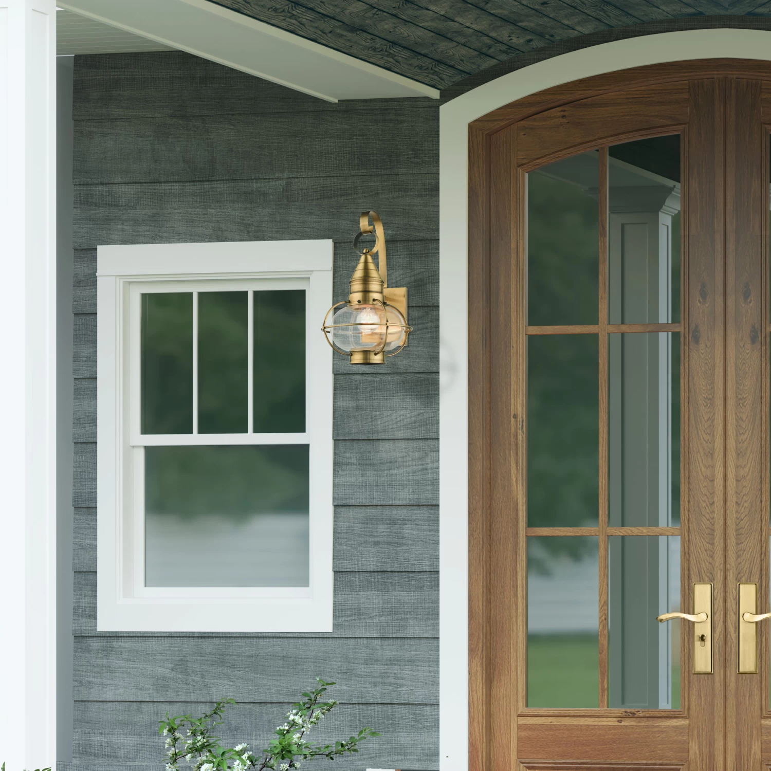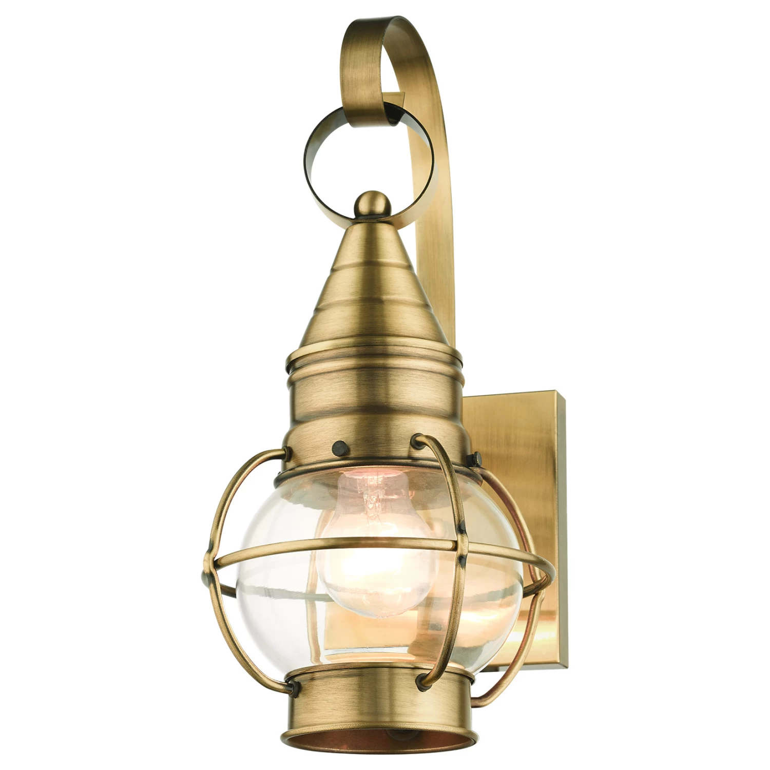 The Newburyport Outdoor Wall Sconce features a classic design style found in nautical settings or railways. It is made of hand-crafted solid brass, and the bulb is housed in a hand-blown clear glass globe.