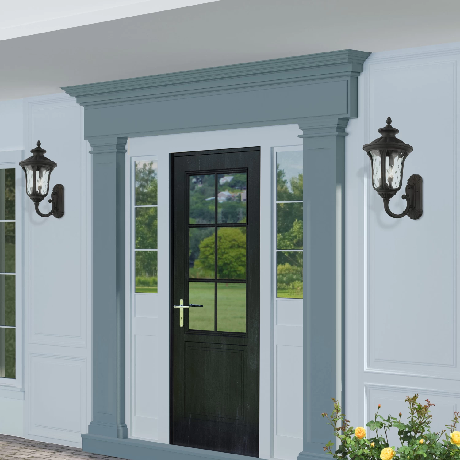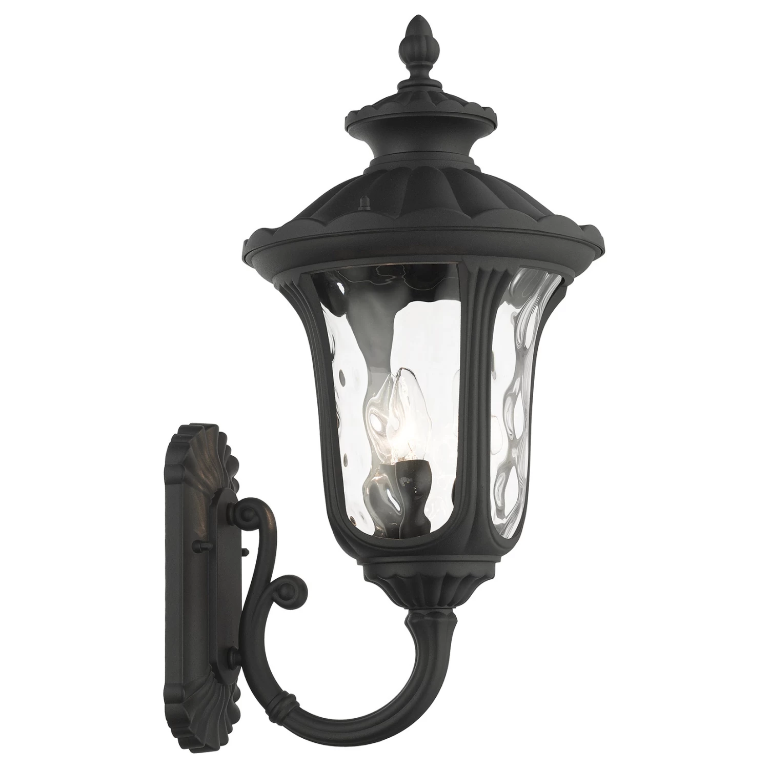 The Oxford Outdoor Upward Wall Sconce brings classic style to your outdoor space. Made of cast aluminum, it features a handsome antique-style wall plate and a lantern lifted up by a decorative arm. The textured water glass casts an appealing light and lends vintage charm.