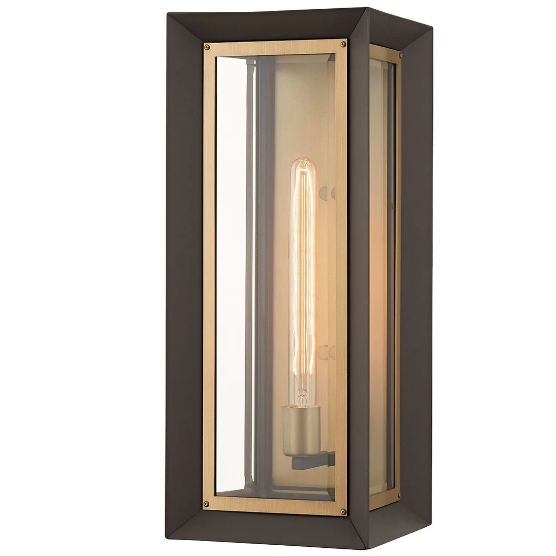 The Lowry Outdoor Wall Sconce is an inverted cube that features a material mix of bronze-finished aluminum and patina brass paired with clear beveled glass for an added layer of finesse. Complex in theory, Lowry is undeniably effortless, adding instant glamour to any exterior.