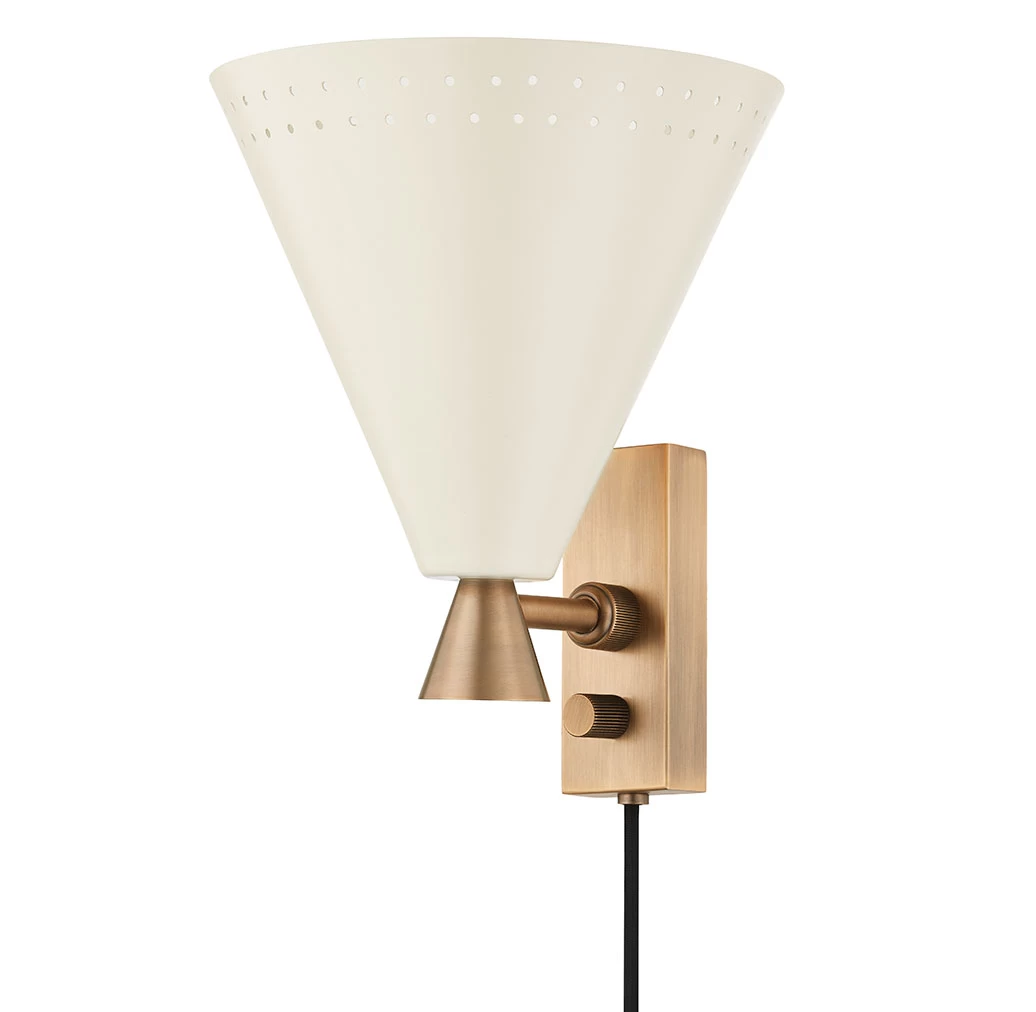 A conical metal shade is topped by a smaller, inverted cone-shaped Patina Brass accent, creating beautiful balance and proportion in this fresh, updated nod to the 1950s, with the Marvin Wall Light. When lit, the perforated shade puts on a dazzling display. Tailored and versatile, this portable wall sconce can be mounted to provide uplight or downlight with either a Soft Sand or Soft Black finish. On/off switch on backplate.