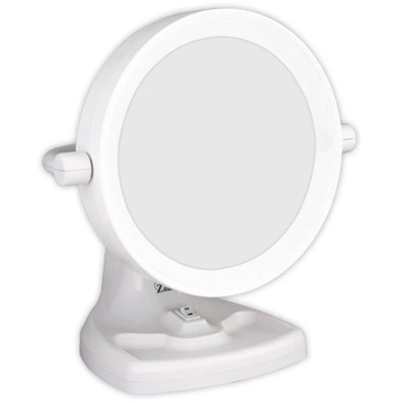 The Max Bright Sunlight Vanity Mirror offers great versatility with a dual sided mirror providing 10x or 1x magnification making makeup application a breeze. It includes a fluorescent light to ensure a clearer reflection and with its unique design may be positioned in a variety of angles for whether you are using the mirror sitting or standing. 6 foot long plug in cord.