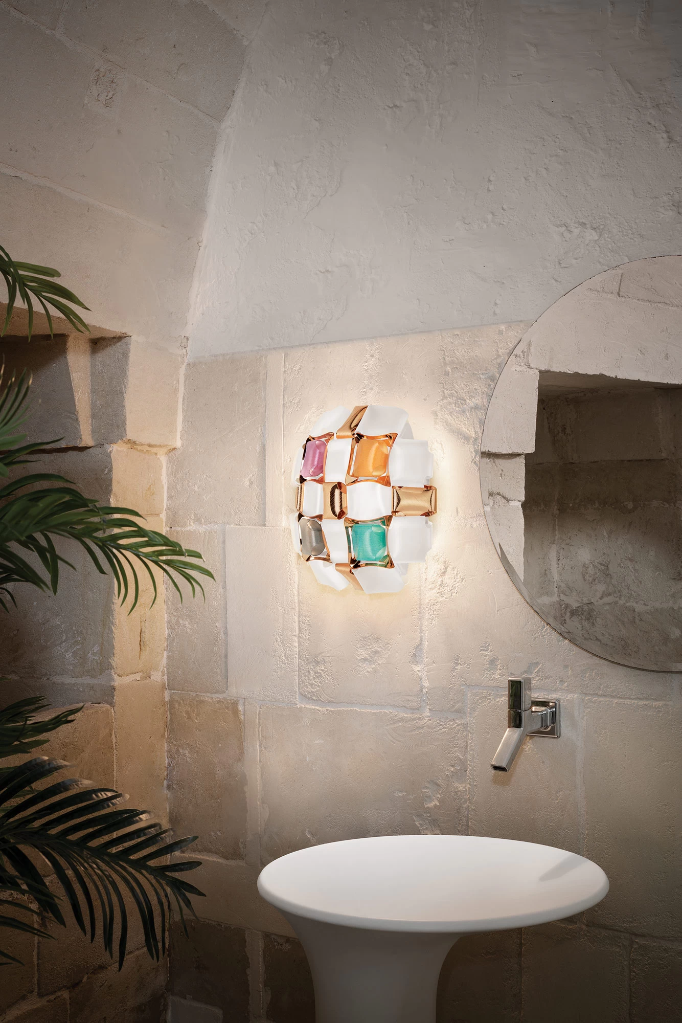 The Mida Wall Sconce is a magnetic system inspired by haute couture jewels. A pave of precious gems encrust an almost invisible setting and polished cabochon are geometrically scattered bringing beauty and style to your space. CE listed.