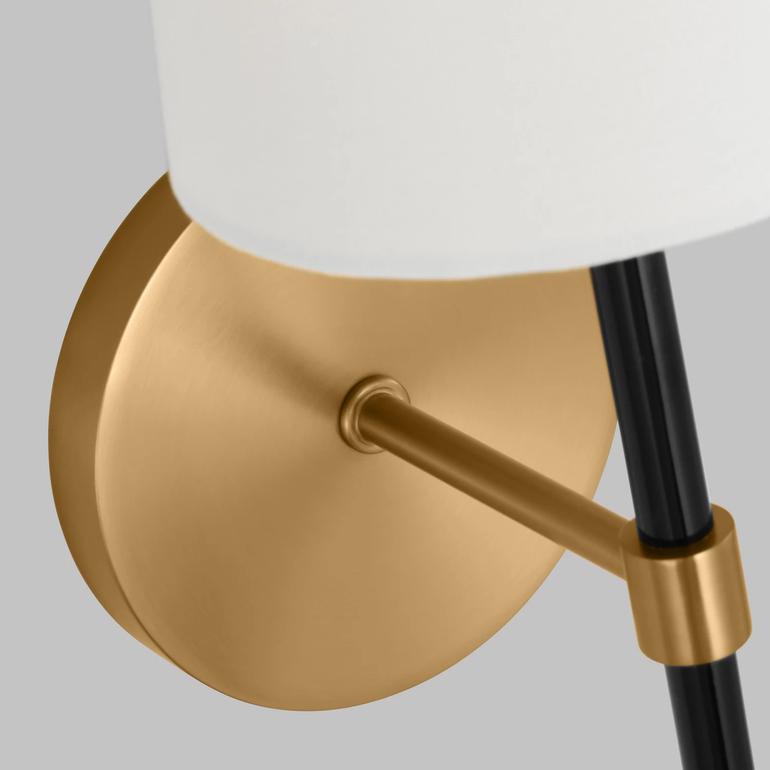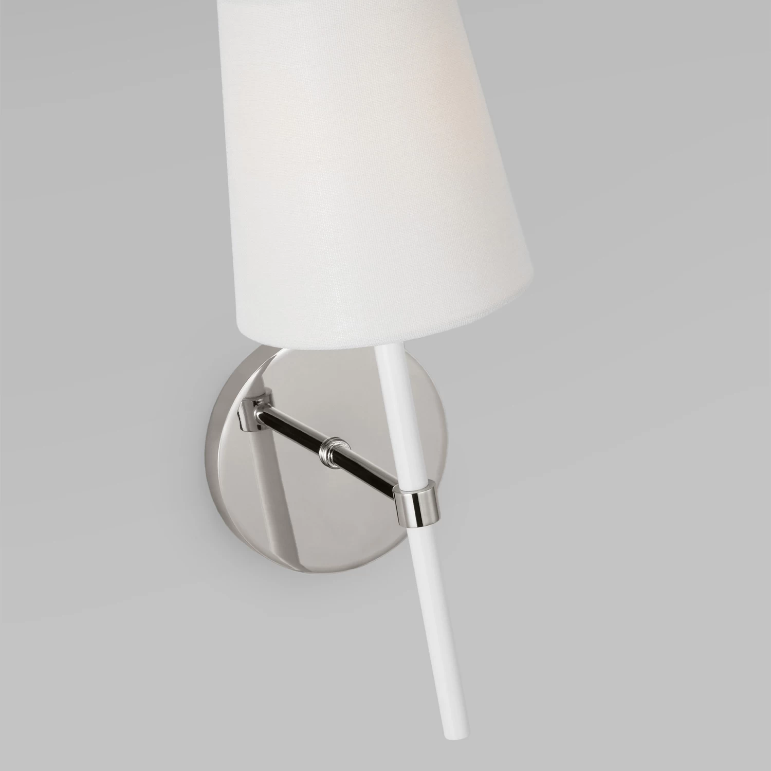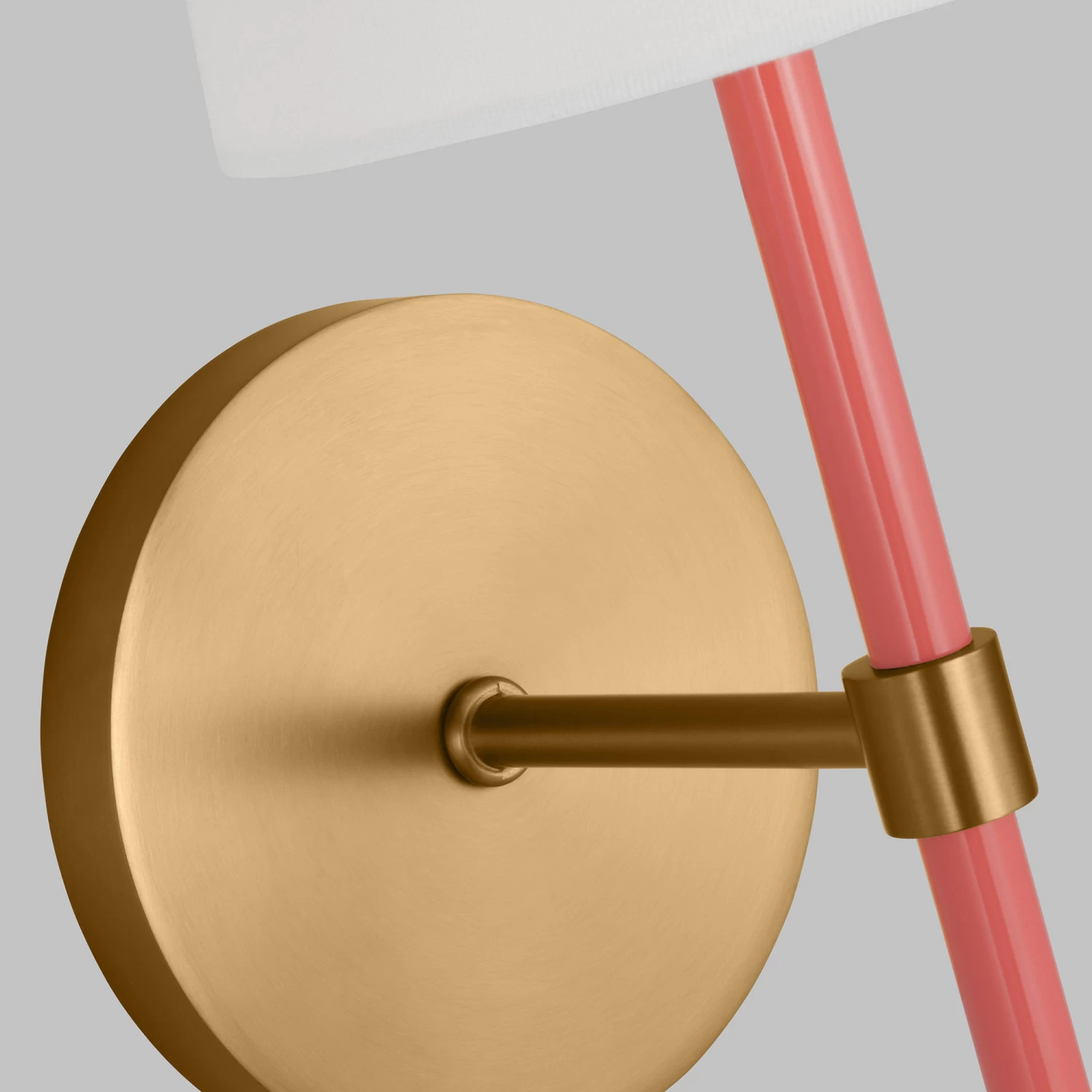 Drawing influence from Kate Spade enameled accessories and the colorful atomic era design of the 1950s, the Monroe Wall Sconce exhibits clean lines with a painted stem and contrasting metal backplate. A white linen shade complements the frame and softens the light. With its chic finishes in neutral tones or fun pops of color, the Monroe delivers a refined modern aesthetic for your bedroom, living room, or hallway.
