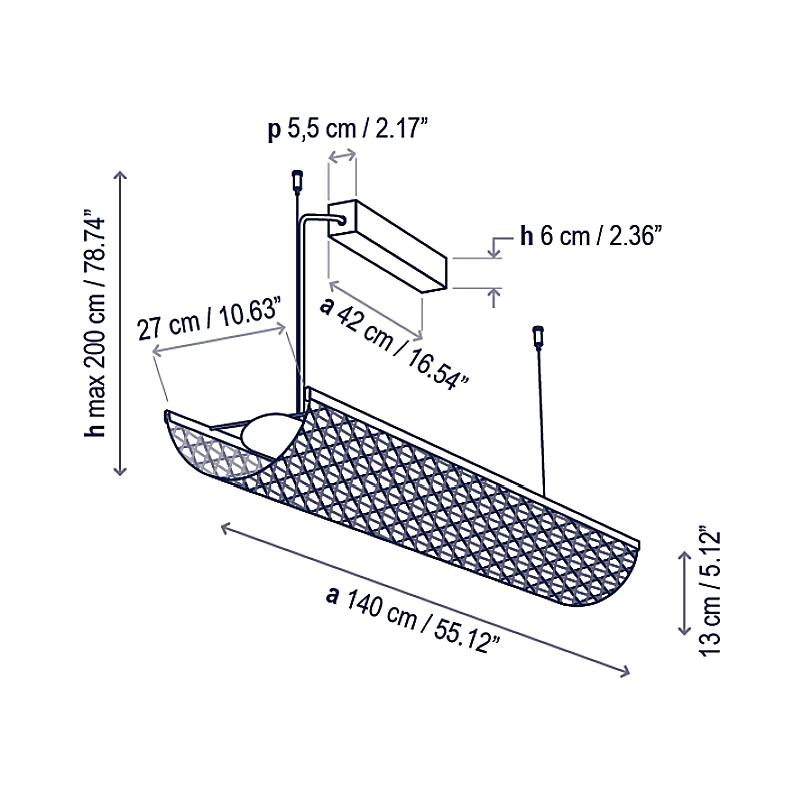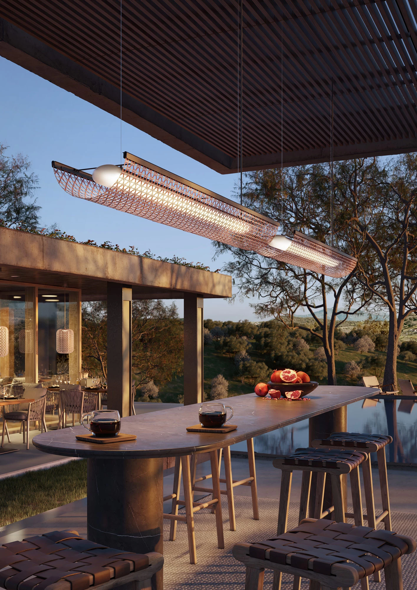 The Nans Balis S/140 Outdoor Linear Pendant combines modern design with Mediterranean charm. Its shade is made of recyclable, non-toxic polyethylene strands, with multiple colors hand-woven together, offering texture and durability for outdoor use. A polyethylene diffuser set in the shade softens the LED light. The Nans is perfect for bringing warm, refreshing light to your deck or patio, or for creating inviting scenes in outdoor lounges and restaurants.
