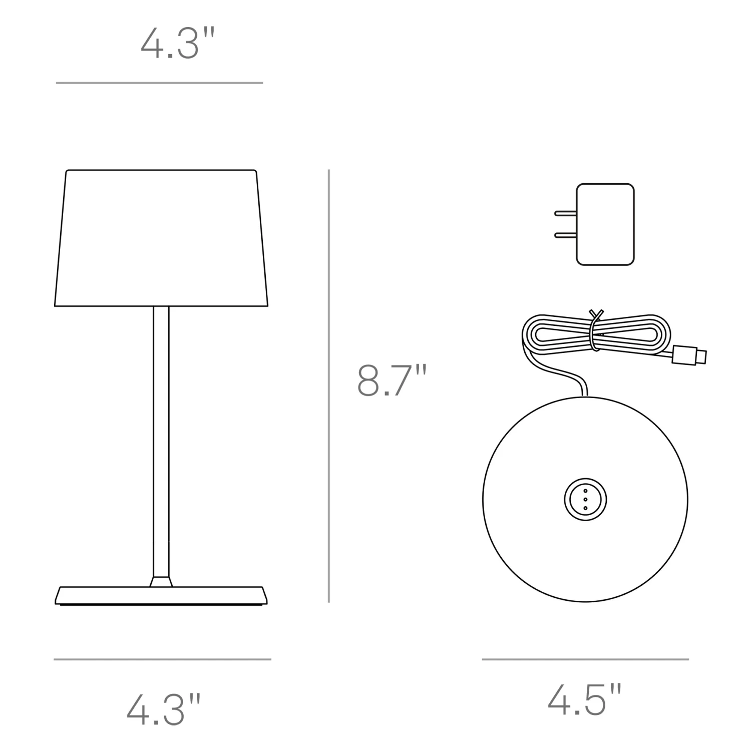 The Olivia Cordless Mini Table Lamp provides an elegant contemporary design in a mini size providing direct illumination. It features a die-cast painted aluminum body and a prismatic polycarbonate diffuser. An integrated dimmer has three color temperature selections: 2200K (candlelight), 2700K (warm white), and 3000K (cool white). The light level will correspond to that which was previously set. Light lasts approx. 9 hours; charging time approximately 6 hours. Induction charging base and 120V AC Adapter Plug included.
