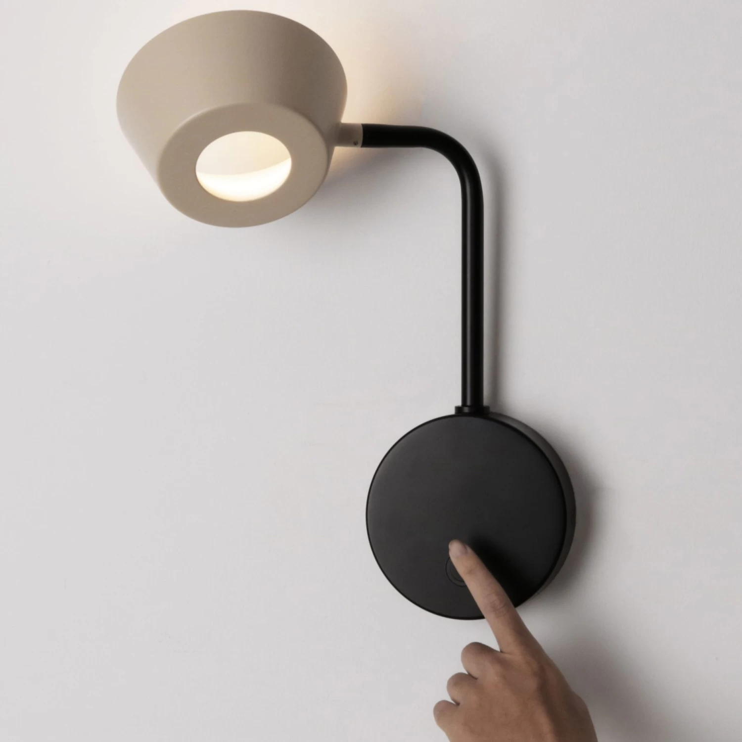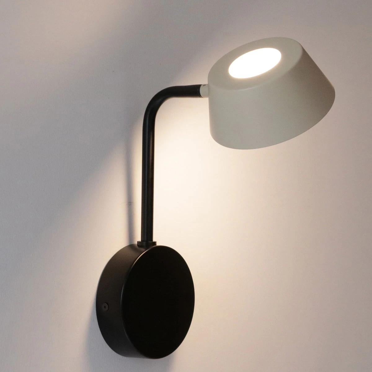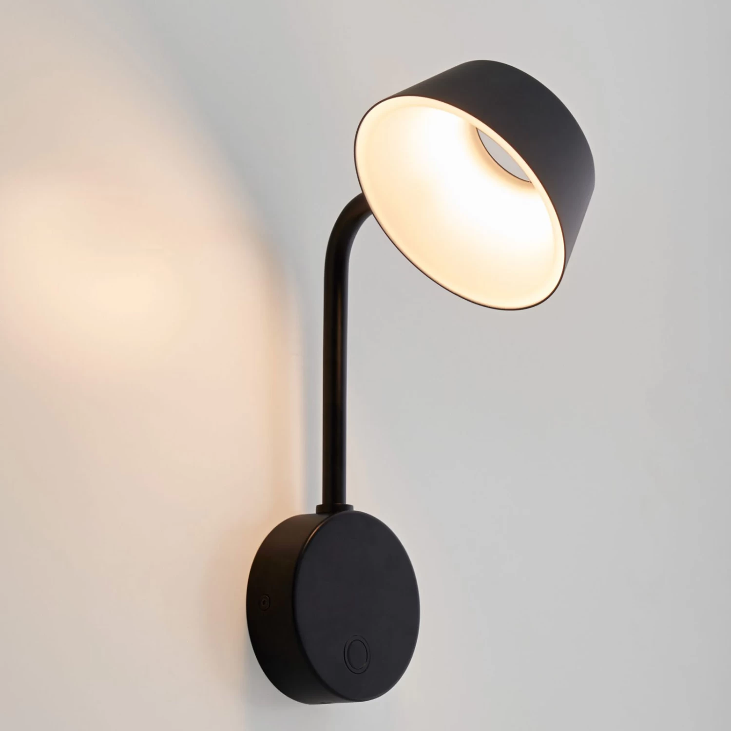The Olo Wall Sconce uses the basic shapes of circles and lines to create a versatile, modern fixture. The round backplate and curving stem support a hollow shade with an integrated glare-free LED. The shade can be rotated 290 degrees, while the arm features a 130 degree range of motion, allowing light to be directed where it is needed most. Includes a built in touch dimmer on the backplate.