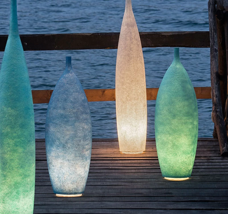 Out Tank 2 Outdoor Floor Lamp is inspired by the moon’s mysteries. Constructed of Nebulite, a specially developed material made of resins and fibers, that mimics the uneven, softly luminescent qualities of the moon’s surface. Features a Blue, Magenta, Turquoise, Orange, Red, or White Shade which casts a pleasant glow on any surface. Includes a 6.5 foot cord with plug. Handmade in Rome, Italy. CE listed.