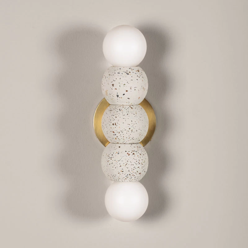 The Paola Wall Sconce features a pair of light bulbs flanking either end of a trio of white terrazzo spheres for a playful, modern aesthetic. The flecks in the terrazzo add an earthiness to the design and complement the backplate’s warm brass finish.