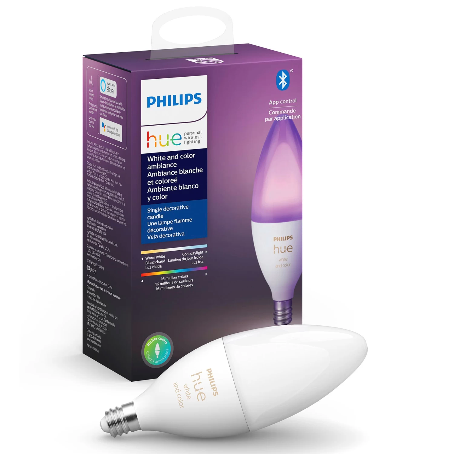 The Philips Hue E12 White/Color Ambiance Smart Bulb features a tunable white light source (2200K-6500K) and a full range of colors to provide the perfect ambiance for any space. Color and dimming settings can be controlled from a smartphone via the Philips Hue App or with a compatible smart home speaker.