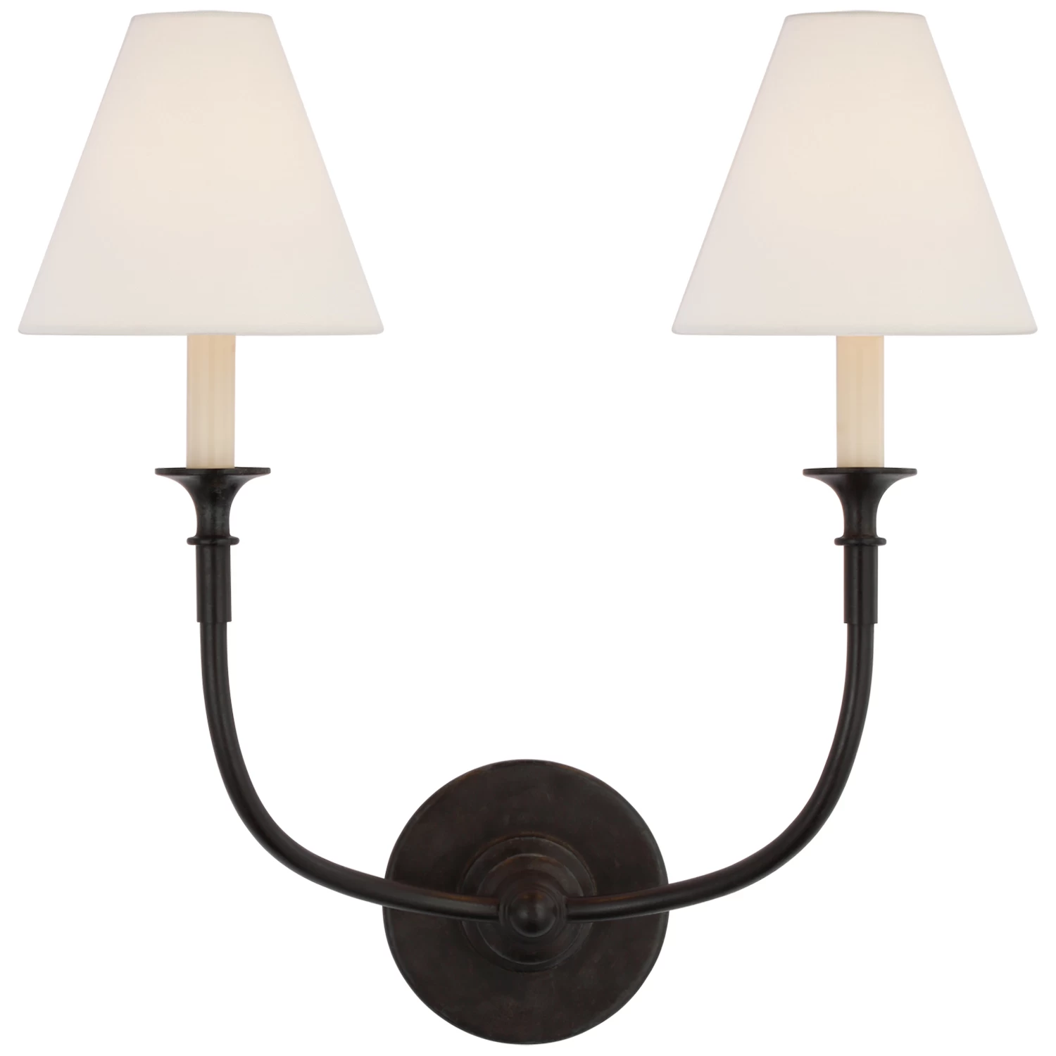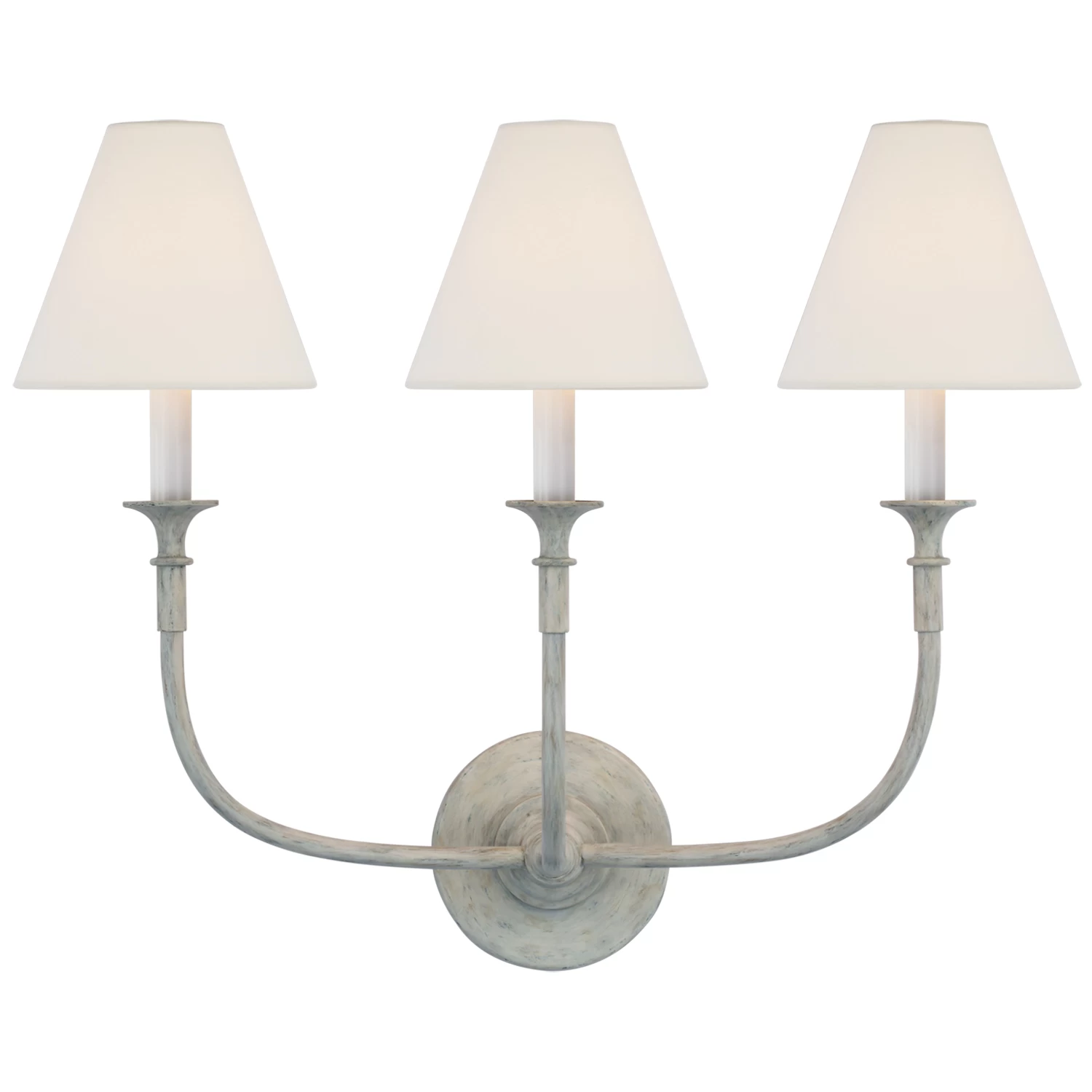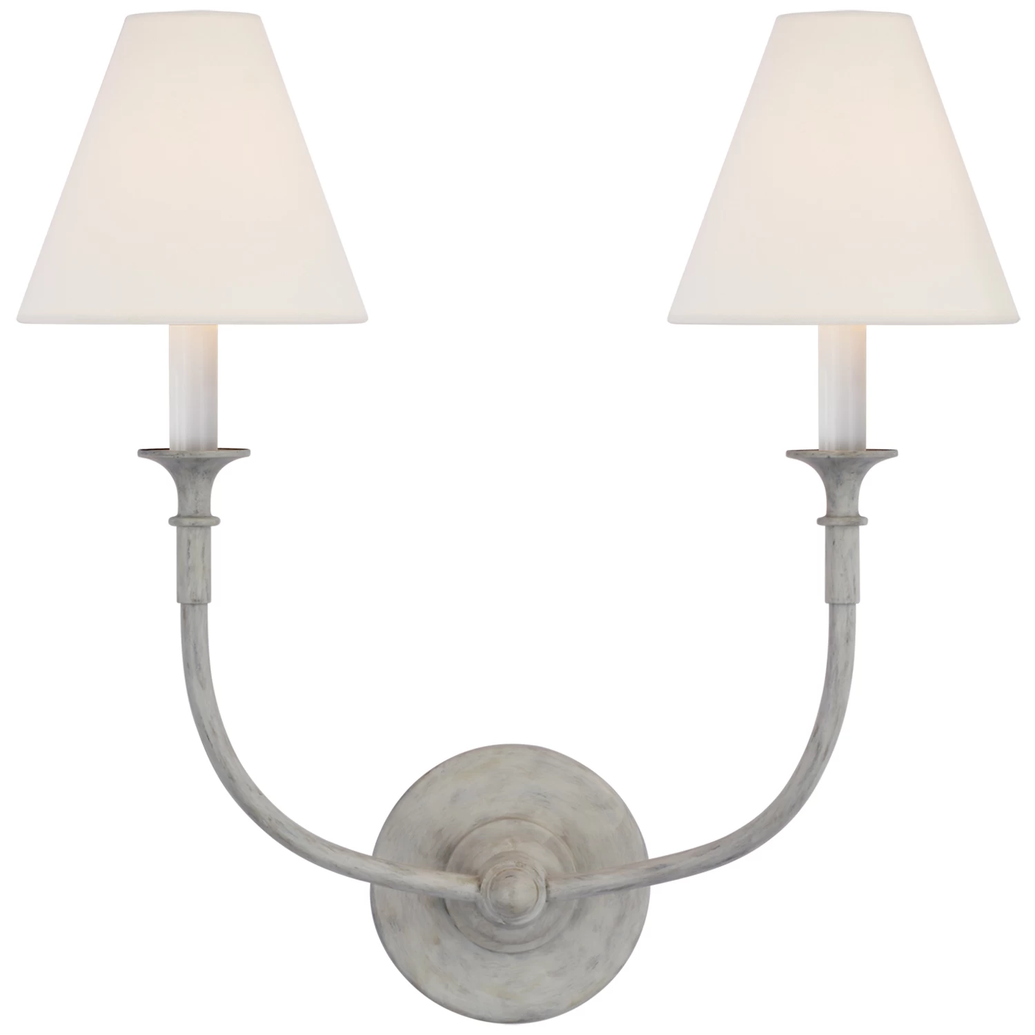 The Piaf Wall Sconce brings a clean, airy feel to your interior space. The steel frame is accented with decorative hubs and topped with conical linen shades that cast warm shadows across your room.
